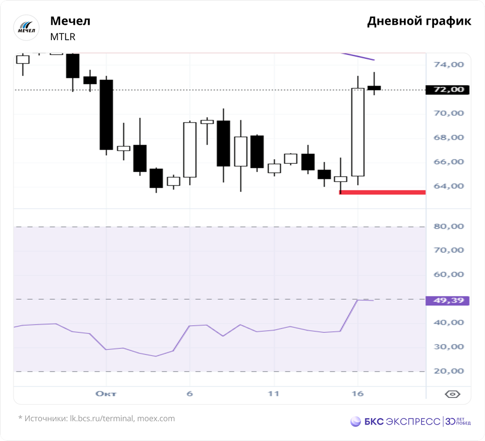 Мнение: БКС Экспресс Анализ акций Мечела Акции компании «Мечел» на прошлой торговой сессии показали значительный рост, увеличившись на 11,19%. На закрытии торгов цена составила 72,13 рубля. Бумаги компании превзошли рыночные показатели, а объем торгов достиг 1,53 млрд рублей. 🔸 Краткосрочная картина • В четверг акции «Мечела» росли вместе с рынком. Цена преодолела уровень сопротивления 70,45 рублей, что отменило цели падения 60,22–59,45 и 55,46 на дневном графике. Текущий максимум установлен на отметке 73,44 рубля. • Внимание приковано к попытке пробоя уровня 75,38 рублей. Если этот уровень устоит, текущее движение можно считать отскоком, и возможно возобновление падения на следующей неделе. • Важные уровни сопротивления и поддержки остаются: 75,38 и 61,56 рублей. 🔸 Внешний фон • Индекс S&P 500 в четверг снизился на 0,69%, а утром был в минусе на 0,6%. Индексы Азиатско-Тихоокеанского региона (АТР) торгуются преимущественно в красной зоне. Нефть Brent упала на 1,37% в четверг, а утром была в минусе на 0,3%. Уровни сопротивления: 73,44/75,38/84,84 Уровни поддержки: 63,41/61,56/54,14 🔸 Долгосрочная картина • На недельном графике выполнены все цели падения: 78,54, 73,19 и 70,42. • Цена пробила минимум февраля 2022 года — 64,94 рубля. Сформированные цели ускорения — 61,56 и 58,81. Этот сценарий актуален, пока не будет сломлен уровень сопротивления 75,38 рублей. • Локальные цели движения рассматриваются в краткосрочной картине. • Основное внимание в долгосрочной картине — закрытие недельной свечи в конце торгов пятницы. • Сохраняем «негативный» взгляд на бумагу. Это связано с низкими ценами на уголь, высокими ставками, которые вынуждают увеличивать долг, и кризисом в стальном и угольном секторах России и Китая. • Высокие ставки при низких ценах на уголь и сталь приводят к росту долга. Котировки коксующегося угля марки ГЖ в портах Дальнего Востока снизились примерно на 11% в долларах с начала года. При этом ключевая ставка ЦБ РФ остаётся высокой. У компании около 90% кредитов в рублях по плавающей ставке. Мы оцениваем, что в текущих условиях «Мечелу» не хватает EBITDA для выплаты процентов, что приведёт к росту долга в этом году. Это уже отразилось в результатах за первое полугодие. Мы ожидаем «негативный» прогноз для рынка стали и коксующегося угля на ближайшие один-два квартала. Стройсезон 2025 года завершается слабо, и цены, вероятно, останутся под давлением до конца года. Автор: Мамонтов Андрей Не является индивидуальной инвестиционной рекомендацией Интересуют конкретные акции или сектора❓ А может новости или тренды на фондовом рынке❓ Или не знаете, «что купить» и «когда продать»❓ Тогда Вам в нашу экосистему 🤝 Подпишитесь на нужные каналы в [M O N D I A R A](https://i.mondiara.com/) и получайте только ту информацию, которая важна именно Вам❗️ 👉 вот ссылка на канал от куда новость, с которой Вы ознакомились: https://i.mondiara.com/i/c/mechel_analytics А, чтобы мы всегда были рядом скачай приложение уже сейчас и убедитесь в его эффективности! Валюта расчёта - Ваши добрые мысли! Спасибо, что с нами! [Скачать](https://apps.apple.com/ru/app/m-o-n-d-i-a-r-a/id6475953453), если у Вас айфон: [App Store](https://apps.apple.com/ru/app/m-o-n-d-i-a-r-a/id6475953453) [Скачать](https://play.google.com/store/apps/details?id=com.mondiara.app), если не любите яблоки [Google Play](https://play.google.com/store/apps/details?id=com.mondiara.app) Источник: bcs-express.ru