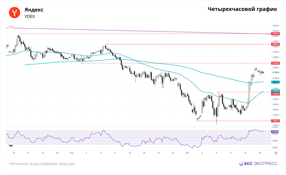 Мнение: БКС Экспресс Анализ акций компании Яндекс В понедельник акции Яндекса подорожали на 0,92% и закрылись на уровне 4155 рублей. Объем торгов был средним — 2,3 миллиарда рублей. Сегодня утром котировки упали на 2,1%. Краткосрочная перспектива • Акции Яндекса немного выросли вчера, несмотря на невысокую активность. Большинство российских бумаг в понедельник показали положительную динамику. Индекс МосБиржи поднялся на 0,87% за основную сессию и еще на 0,77% к вечеру пятницы. • Весь день акции технологической компании колебались в районе 4150 рублей. • За день сформировалась небольшая черная свеча с нижней тенью. Технический сигнал можно считать нейтральным. • В прошлый четверг акции Яндекса, как и рынок в целом, резко выросли, вернувшись к месячным максимумам. На фоне этого роста они снова поднялись выше 200-дневной скользящей средней. • Крупные продажи на графике не наблюдались. Спекулянты продолжают удерживать длинные позиции. Если новых драйверов роста не появится, возможен небольшой откат, но в целом восходящая тенденция сохраняется. • В пятницу состоится очередное заседание ЦБ РФ по ключевой ставке. Это может снизить торговую активность на неделе, так как многие участники рынка займут выжидательную позицию. • В ближайшие недели акции могут вырасти до 4425 рублей. • Отскок поддерживается общей динамикой рынка. Индекс МосБиржи стабилизировался около 2750 пунктов. Ближайшее сопротивление ожидается на уровне 2850 пунктов. Внешний фон • В понедельник S&P 500 вырос на 1,07%, но утром фьючерс на него снизился на 0,2%. Индексы Азиатско-Тихоокеанского региона (АТР) двигаются разнонаправленно. Фьючерс на нефть Brent на Мосбирже упал на 0,55%, а на мировых рынках нефть с утра подорожала на 0,2% до $60,9 за баррель. Уровни сопротивления: 4244, 4425, 4525,5 Уровни поддержки: 3970,5, 3695,5, 3489,5 Долгосрочная перспектива • Основной тренд, начавшийся в сентябре 2015 года, остается восходящим и проходит около 1760 рублей. • С ноября 2021 года акции находятся в долгосрочном нисходящем тренде, потеряв 33% от исторических максимумов. • Ближайшие цели — слом этого нисходящего тренда на уровне 4400 рублей и возврат к пикам года на 4750 рублей. • На недельном графике сформировался сигнал роста. За последнюю неделю свеча обновила максимумы предыдущей недели. Сопротивление на старшем таймфрейме находится около 4425 рублей. • Аналитики БКС считают перспективы акций Яндекса «позитивными» и прогнозируют цель на 12 месяцев в размере 6900 рублей. Автор: Решетников Олег Не является индивидуальной инвестиционной рекомендацией Пост взят с соцсети [M O N D I A R A](https://i.mondiara.com/) 👉 вот ссылка на канал: https://i.mondiara.com/i/c/yandex_analytics Скачать в [App Store](https://apps.apple.com/ru/app/m-o-n-d-i-a-r-a/id6475953453) Скачать в [Google Play](https://play.google.com/store/apps/details?id=com.mondiara.app) Валюта расчёта - Ваши добрые мысли! Спасибо, что с нами! Источник: bcs-express.ru