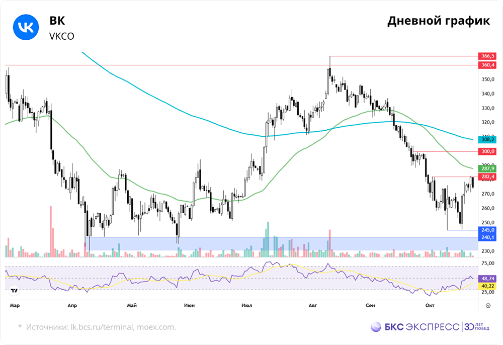 Мнение: БКС Экспресс Прогноз по акциям ВК В понедельник акции VK выросли на 2,62%, достигнув 282,2 рубля. Объем торгов был средним — 0,99 млрд рублей. Сегодня утром бумаги снизились на 0,1% по сравнению с закрытием понедельника. Краткосрочная картина • Бумаги пытаются восстановиться после пятимесячного минимума. Акции индекса МосБиржи показали разнонаправленную динамику. Сам индекс вырос на 0,87% по итогам основной сессии, но на вечерних торгах потерял 0,09% по сравнению с воскресеньем. • В середине августа котировки достигли 366 рублей, после чего началось стремительное падение до 245 рублей. Неуверенная динамика указывала на возможное снижение к следующей поддержке около 240 рублей, но улучшение рыночных настроений позволило отскочить от локального дна и перейти к росту. • Котировки дважды протестировали уровень 245 рублей, усилив его значимость. После отскока они достигли сопротивления около 282 рублей, преодоление которого стало бы первым условием для дальнейшего роста. Однако характер предыдущей динамики вызывает сомнения в быстром пробое этого уровня. • Объем торгов остается около средних значений во время роста. Внешний позитив оказывает ограниченное влияние на акции, так как для компании важнее монетарные факторы, чем геополитические. По итогам заседания Банка России ожидается сохранение ключевой ставки на уровне 17%, что усиливает значение комментариев регулятора. Для успешного роста акций VK необходимо, чтобы сигнал ЦБ был не слишком жестким. • Переговоры лидеров США и России постепенно реализуются. Вчера Сергей Лавров встретился с Марко Рубио. Возможным негативом могло стать приближение принятия 19-го пакета санкций ЕС, но эта новость уже была учтена в ценах. • RSI находится в нейтральной зоне. Котировки торгуются ниже 200-дневной скользящей средней на всех графиках, кроме часового. Внешний фон В понедельник S&P 500 вырос на 1,07%. Сегодня утром фьючерс на S&P 500 прибавил 0,1%. Индексы Азиатско-Тихоокеанского региона торгуются в основном в плюсе. Цены на нефть Brent падают на 0,3% до $60,8 за баррель с утра на мировых рынках. Уровни сопротивления: 282, 300, 308. Уровни поддержки: 245, 240, 230. Долгосрочная картина • В августе 2023 года началась коррекция от локального максимума. К концу 2024 года падение приостановилось, а нисходящий тренд был преодолен в июле этого года. • С конца 2024 года сформировался широкий боковик 230–360, границы которого неоднократно тестировались. • Котировки торгуются ниже 200-дневной скользящей средней с середины сентября 2025 года. • Умеренный фундаментальный позитив обусловлен господдержкой по IPO и SPO, а также развитием проекта национального мессенджера на базе VK. В то же время давление на акции оказывают новые фискальные меры и осторожная политика Банка России. • Акции VK имеют тенденцию двигаться сильнее рынка, что связано с высокой чувствительностью к процентным ставкам и низкой рентабельностью бизнеса. • Целевая цена аналитиков БКС на год составляет 380 рублей. Их взгляд — «Нейтральный». Автор: Смирнов Андрей Не является индивидуальной инвестиционной рекомендацией Пост взят с соцсети [M O N D I A R A](https://i.mondiara.com/) 👉 вот ссылка на канал: https://i.mondiara.com/i/c/vk_analytics Скачать в [App Store](https://apps.apple.com/ru/app/m-o-n-d-i-a-r-a/id6475953453) Скачать в [Google Play](https://play.google.com/store/apps/details?id=com.mondiara.app) Валюта расчёта - Ваши добрые мысли! Спасибо, что с нами! Источник: bcs-express.ru