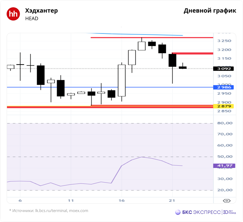 Мнение: БКС Экспресс Прогноз по акциям Хэдхантера Акции HeadHunter на прошлой торговой сессии потеряли в цене 2,45%, закрывшись на уровне 3104 рублей. Бумаги показали лучшие результаты, чем рынок в целом, с объемом торгов 0,53 миллиарда рублей. Краткосрочная перспектива • В первой половине октября акции двигались в пределах 2986–2879 рублей на дневном графике. • Сейчас на графике появился первый импульс роста и откат. Если цена пробьет уровень 3183 рубля, откроется путь к первой зоне подъема 3414–3444 рублей. Этот сценарий возможен, пока не будет сломлен минимум 2881 рубль. • На дневном графике RSI находится на уровне 41 пункта. На 4-часовом графике котировки расположены между 50-дневной и 200-дневной скользящими средними. Основное внимание уделяем уровням сопротивления и поддержки: 3183 и 2881 рубль. Внешний фон Индекс S&P 500 во вторник снизился на 0,01%, а с утра показал рост на 0,2%. Индексы АТР демонстрируют разнонаправленную динамику. Нефть Brent во вторник подорожала на 0,51%, а с утра выросла на 1,6%. Уровни сопротивления: 3183, 3270, 3675 рублей. Уровни поддержки: 3007, 2881, 2868 рублей. Долгосрочная перспектива • На недельном графике были достигнуты цели ускорения падения — 3015 и 2884 рубля. Минимум установлен на уровне 2881 рубля. После этого началась реакция покупателей. Продавцы не смогли преодолеть поддержку 2868 рублей. • Ждем выхода из диапазона 3270–2881 рублей для оценки дальнейших целей на недельном графике. • Краткосрочные и среднесрочные движения анализируем в краткосрочной картине. В долгосрочной перспективе важно следить за закрытием недельной свечи в конце торгов пятницы. • HeadHunter — ведущий игрок на рынке онлайн-рекрутмента в России и должен выиграть от цифровизации рынка в долгосрочной перспективе. • 12–14 ноября компания представит финансовые результаты по МСФО за третий квартал 2025 года. • Ожидается, что динамика показателей останется слабой из-за негативного влияния высоких процентных ставок на найм персонала в России. Это может привести к снижению EBITDA и чистой прибыли по сравнению с аналогичным периодом предыдущего года. • Мы считаем слабые показатели временными и связанными с чувствительностью бизнеса HeadHunter к экономической активности. • В фокусе: текущая динамика бизнеса и клиентского спроса, конкуренция, регуляторная среда и ожидания по результатам за весь 2025 год. Не является индивидуальной инвестиционной рекомендацией Пост взят с соцсети [M O N D I A R A](https://i.mondiara.com/) 👉 вот ссылка на канал: https://i.mondiara.com/i/c/headhunter_analytics Скачать в [App Store](https://apps.apple.com/ru/app/m-o-n-d-i-a-r-a/id6475953453) Скачать в [Google Play](https://play.google.com/store/apps/details?id=com.mondiara.app) Валюта расчёта - Ваши добрые мысли! Спасибо, что с нами! Источник: bcs-express.ru