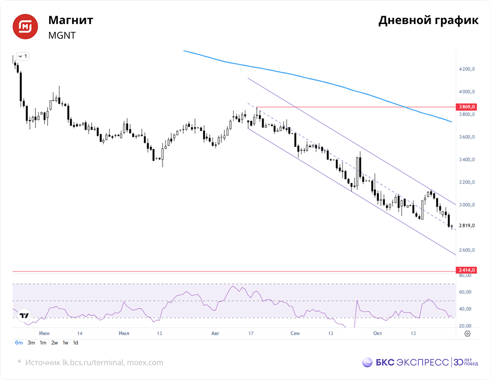 Мнение: БКС Экспресс Аналитика по акциям Магнита Вчера акции «Магнита» снизились на 3,64%, до 2810 руб. Общий объем торгов составил 1 млрд руб. Сегодня утром на старте торгов бумаги выросли на 0,39%, до 2821 руб. Краткосрочная перспектива • Вчерашний обвал стоимости сопровождался умеренным ростом торгового оборота. Акции ритейлера вновь достигли минимума с февраля 2022 года. Временная поддержка возникла около 2800 руб. Утром бумаги падали ниже этой отметки, но быстро восстановились. • Закрытие сессии прошло значительно ниже 200-часовой скользящей средней. Это создало негативную техническую картину. Утреннее значение индекса относительной силы RSI указывает, что бумаги вышли из вчерашней краткосрочной перепроданности. • В ближайшие дни акции «Магнита» могут стабилизироваться около текущих 2800 руб. Однако быстрый и сильный рост пока маловероятен. Внешний фон Индекс S&P 500 вырос на 1,23% вчера. Утром фьючерсы на S&P 500 слегка снизились на 0,1%. Основные азиатские индексы показывают смешанную динамику. Нефть Brent подешевела на 0,3% до $65,4 за баррель. Уровни сопротивления: 2850 / 2890 / 2930 Уровни поддержки: 2780 / 2760 / 2730 Долгосрочная перспектива • К концу октября акции «Магнита» опустились ниже 200-дневной скользящей средней. Очередное обновление долгосрочного минимума ухудшает прогнозы на ближайшие недели. • Бумаги сместились в нижнюю часть своего многолетнего диапазона. Долгосрочная техническая картина стала негативной. • Прогноз на год по акциям «Магнита» — 4200 руб., что предполагает рост на 49% от текущих уровней. Автор: Манжос Виталий Не является индивидуальной инвестиционной рекомендацией Пост взят с соцсети [M O N D I A R A](https://i.mondiara.com/) 👉 вот ссылка на канал: https://i.mondiara.com/i/c/magnit_analytics Скачать в [App Store](https://apps.apple.com/ru/app/m-o-n-d-i-a-r-a/id6475953453) Скачать в [Google Play](https://play.google.com/store/apps/details?id=com.mondiara.app) Валюта расчёта - Ваши добрые мысли! Спасибо, что с нами! Источник: bcs-express.ru