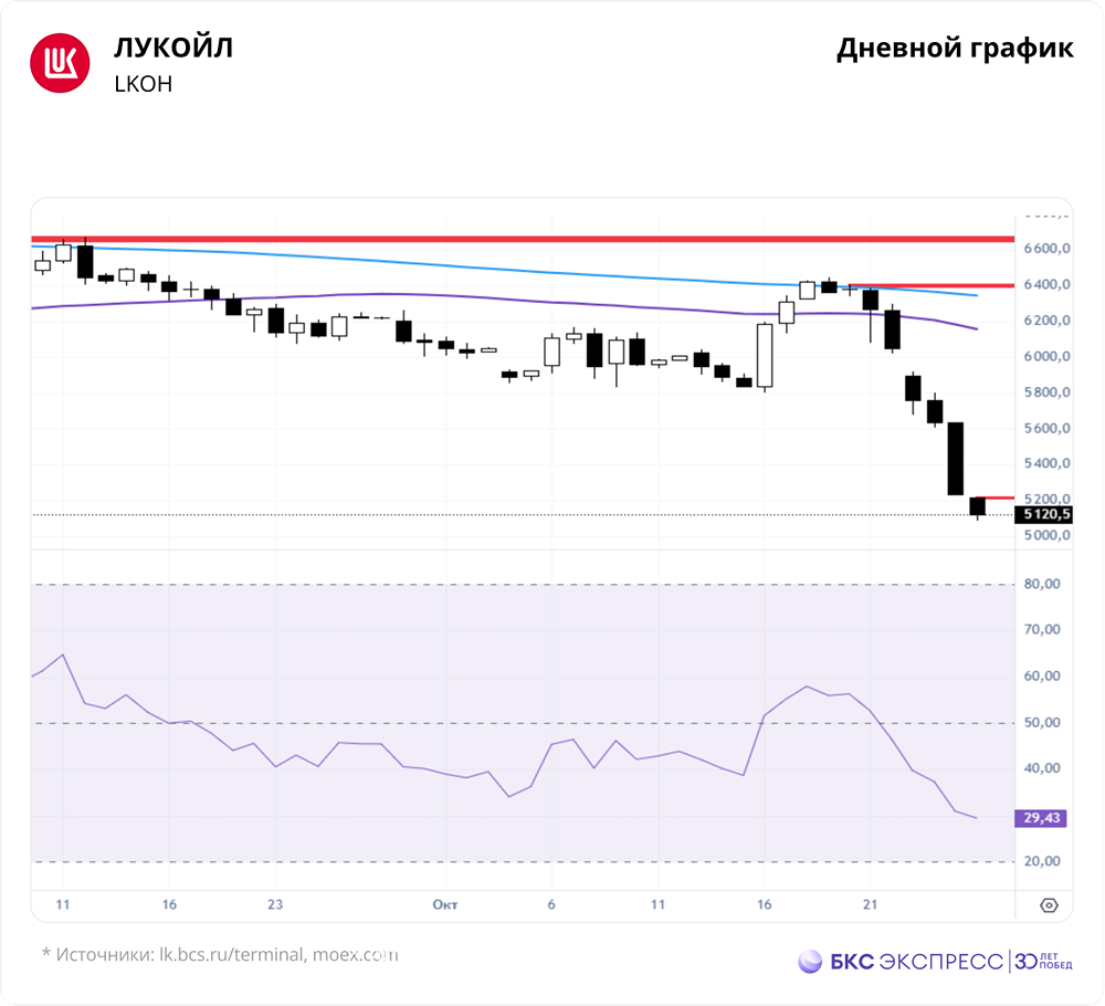 Мнение: БКС Экспресс Прогноз по акциям Лукойла Акции ЛУКОЙЛа упали на 7,08% на прошлой торговой сессии, закрывшись на уровне 5237 рублей. Бумаги показали худшую динамику по сравнению с рынком, объем торгов составил 26,86 млрд рублей. Краткосрочная перспектива • В понедельник цена достигла целевого уровня 5435 рублей, но во вторник утром падение продолжилось. Сейчас акции находятся вблизи следующей цели — 5065 рублей, установленной в долгосрочной перспективе. Текущий минимум зафиксирован на отметке 5077,5 рублей. • Пока сопротивление на уровне 5219 рублей не пробито, возможно продолжение снижения к следующей цели — 5065 рублей. • Если сопротивление 5219 рублей будет преодолено, возможен отскок. • На дневном графике индекс RSI находится на уровне 30 пунктов. На 4-часовом графике акции торгуются ниже 50- и 200-дневной скользящих средних. Основное внимание уделяется уровням сопротивления и поддержки: 5219 и 5077,5 рублей. Внешний фон • Индекс S&P 500 вырос на 0,77% в пятницу и на 0,8% утром в понедельник. Индексы АТР торгуются в плюсе. Нефть Brent упала на 0,41% в пятницу и на 0,2% утром в понедельник. Уровни сопротивления и поддержки: • Сопротивление: 5219, 6406, 6444 рублей. • Поддержка: 5077,5, 5065, 4965 рублей. Долгосрочная перспектива • Сценарий перешел на сторону продавцов. В понедельник акции достигли цели падения 5510 рублей. Следующие цели: 5435 (уже достигнута), 5065 и 5000 рублей. Пока сопротивление на уровне 6406 рублей не пробито, контроль остается за продавцами. • Давление на акции оказывает введение санкций. Они затрагивают компании, где Роснефть и ЛУКОЙЛ владеют более 50%. Мы ожидаем, что под санкции попадет и Башнефть, контроль над которой осуществляет Роснефть. • ЛУКОЙЛ может столкнуться с проблемами в международном трейдинге и работе НПЗ в Болгарии и Румынии, но масштабы ущерба сложно предсказать. С 2023 года условия работы НПЗ в этих странах ухудшились из-за эмбарго ЕС на морские поставки нефти из России и дополнительных ограничений со стороны Болгарии. Это заставило ЛУКОЙЛ задуматься о продаже актива. • Аналитики БКС сохраняют позитивный взгляд на акции ЛУКОЙЛа. По показателю EV/EBITDA на 2026 год акции торгуются с дисконтом в 2,8 раза к историческому среднему уровню в 3,2 раза. Дивиденды • ЛУКОЙЛ перенес заседание Совета директоров, запланированное на 23 октября, из-за текущих обстоятельств. Повестка дня остается прежней. Мы ожидаем решения по дивидендам от СД. • Ранее сообщалось, что ЛУКОЙЛ может выплатить дивиденды за первое полугодие 2025 года. Наша оценка составляет 352 рубля на акцию, рыночные прогнозы варьируются от 350 до 440 рублей на акцию. Автор: Мамонтов Андрей Не является индивидуальной инвестиционной рекомендацией Пост взят с соцсети [M O N D I A R A](https://i.mondiara.com/) 👉 вот ссылка на канал: https://i.mondiara.com/i/c/lukoil_analytics Скачать в [App Store](https://apps.apple.com/ru/app/m-o-n-d-i-a-r-a/id6475953453) Скачать в [Google Play](https://play.google.com/store/apps/details?id=com.mondiara.app) Валюта расчёта - Ваши добрые мысли! Спасибо, что с нами! Источник: bcs-express.ru