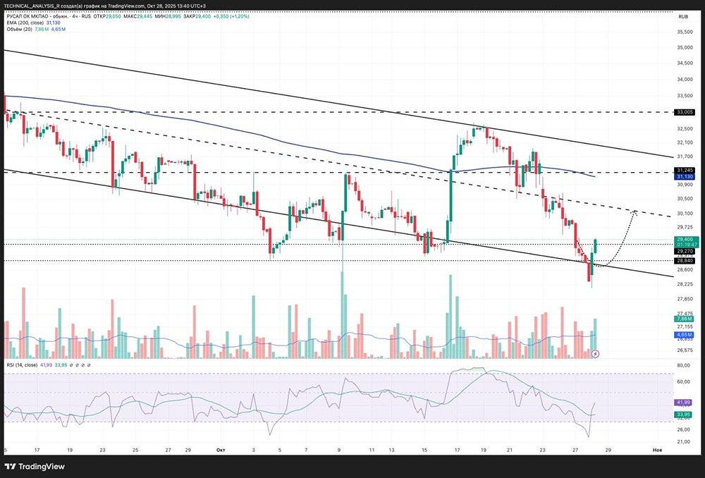 Какие цели роста у акций? РУСАЛ пытается восстановиться после ложного пробоя нижней границы нисходящего канала. Покупатели вернули цену внутрь диапазона, что указывает на попытку разворота краткосрочного тренда. RSI развернулся вверх от перепроданности, а объёмы показывают приток интереса к бумаге. Ближайшая цель движения — середина канала в районе 30, где может появиться первая зона сопротивления. Закрепление выше неё откроет путь к 31–31.5. Пока сценарий лонга сохраняется, поддержка остаётся в районе 28.6. Не является индивидуальной инвестиционной рекомендацией Пост взят с соцсети [M O N D I A R A](https://i.mondiara.com/) 👉 вот ссылка на канал: https://i.mondiara.com/i/c/rusal_analytics Скачать в [App Store](https://apps.apple.com/ru/app/m-o-n-d-i-a-r-a/id6475953453) Скачать в [Google Play](https://play.google.com/store/apps/details?id=com.mondiara.app) Валюта расчёта - Ваши добрые мысли! Спасибо, что с нами! Источник: Капибара на Бирже