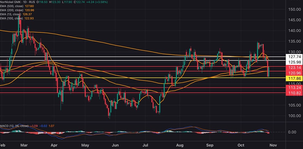 Сможет ли «Норникель» пробить сопротивление ₽126–127,8? Акции «Норникеля» (GMKN) в настоящее время находятся в зоне технической неопределённости. После отскока от поддержки в районе 117,5–120 рублей акции уперлись в важное сопротивление на уровне 123 рублей. Пробой этого уровня откроет путь к следующим сопротивлениям — 126–127,8 рублей, но его отсутствие может привести к развороту и снижению к уровню 110–113 рублей. [```14```](https://www.tbank.ru/invest/social/profile/stary_trader/12658b62-aeb8-4d9e-9ca8-b9c842519ed5/) Текущая ситуация Технические факторы: - Сопротивление 123 рубля: ключевой уровень, который пока не удаётся преодолеть. Если акции не закрепятся выше, высок риск разворота вниз. - Поддержка 117,5–120 рублей: уровень, от которого ранее происходил отскок. Его пробой вниз может усилить негативный сценарий. - Уровни сопротивления: 126–127,8 рублей — следующая зона, которую предстоит преодолеть при продолжении роста. - Уровни поддержки: 110–113 рублей — потенциальная цель снижения в случае разворота тренда. Фундаментальные факторы: - Производственные показатели: за 9 месяцев 2025 года производство никеля снизилось на 4% (до 140 тыс. тонн), меди — на 4% (до 313 тыс. тонн), палладия — на 6% (до 2,016 млн унций), платины — на 7% (до 484 тыс. унций). Причины: переход на новую горную технику, рост доли вкрапленной руды, необходимость восполнения незавершённого производства. [```1```](https://finance.rambler.ru/business/55510268-nornikel-podtverdil-proizvodstvennyy-prognoz-na-god/)[```2```](https://nornickel.ru/news-and-media/press-releases-and-news/nornikel-obyavlyaet-itogi-proizvodstvennoy-deyatelnosti-za-devyat-mesyatsev-2025-goda/) - Финансовые результаты: за первое полугодие 2025 года выручка выросла на 15% (до 6,5 млрд долларов), EBITDA — на 12% (до 2,6 млрд долларов), чистая прибыль — на 2% (до 842 млн долларов). Свободный денежный поток увеличился почти в 3 раза (до 1,4 млрд долларов). Однако чистый долг вырос на 22% (до 10,5 млрд долларов) из-за укрепления рубля. [```8```](https://dzen.ru/a/aKbYqZQk9AInPxM9)[```16```](https://www.aton.ru/ideas/nornikel_klyuchevye_rezultaty_za_pervoe_polugodie_2025_goda/) - Долговая нагрузка: соотношение чистого долга к EBITDA составляет 1,9x, что выше уровня конца 2024 года (1,7x). Высокие процентные выплаты (около 160 млрд рублей в год) ограничивают возможности для дивидендов. [```8```](https://dzen.ru/a/aKbYqZQk9AInPxM9)[```15```](https://smart-lab.ru/blog/1193183.php) Риски и возможности Риски: - Волатильность цен на металлы: никель и палладий находятся под давлением из-за избытка предложения и перехода автопрома на электромобили. Медь демонстрирует рост, но её доля в выручке компании составляет около 31%. [```3```](https://www.Finam.ru/publications/item/aktsii-nornikelya-interesny-strategicheski-s-gorizontom-3-5-let-20250208-1700/)[```9```](https://www.Finam.ru/publications/item/ukreplenie-medi-vystupit-katalizatorom-rosta-dlya-nornikelya-20251007-1025/) - Санкции и геополитика: ограничения на экспорт оборудования и логистику, риск блокировки расчётов в долларах/евро. [```7```](https://www.tbank.ru/invest/social/profile/Danila_Alekseevich1292/57abf69f-3328-40c9-93c5-8dd02fd38c79/) - Высокая долговая нагрузка: обслуживание долга с плавающей ставкой съедает значительную часть денежного потока. [```4```](https://www.tbank.ru/invest/social/profile/Sherlock_TRD/c29fe8fb-9212-4d48-abcc-a5e9b0db3d9a/) Возможности: - Рост спроса на медь: дефицит предложения к 2025 году может привести к росту цен, что положительно скажется на компании. [```9```](https://www.Finam.ru/publications/item/ukreplenie-medi-vystupit-katalizatorom-rosta-dlya-nornikelya-20251007-1025/) - Стратегия развития до 2030 года: планы по увеличению добычи руды почти в 1,8 раза, росту производства никеля и меди на 30%, МПГ — на 50%. Однако инвестиционная программа требует высоких капитальных затрат. [```15```](https://smart-lab.ru/blog/1193183.php) - Литиевый проект с Росатом