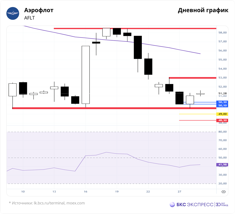 Мнение: БКС Экспресс Прогноз по акциям Аэрофлота На прошлой торговой сессии акции Аэрофлота подскочили на 1,86%, завершив день на уровне 51,03 рубля. Это было лучше рынка. Объем торгов достиг 1,03 миллиарда рублей. Краткосрочные перспективы • После отскока на дневном графике сформировался новый паттерн падения. Первые цели — 50,3–50,1 рубля, вторые — 49–48,3 рубля. Эти уровни актуальны, пока не будет пробит уровень сопротивления 53,07 рубля. • Для дальнейшего снижения к следующим целям дневного графика нужно, чтобы цена пробила поддержку на уровне 49,64 рубля. • На дневном графике индикатор RSI находится на уровне 34 пункта. На 4-часовом таймфрейме акции ниже 50- и 200-дневных скользящих средних. Основное внимание уделяется уровням сопротивления и поддержки: 53,07 и 49,64 рубля. Внешний фон Индекс S&P 500 в понедельник вырос на 0,25%. С утра он прибавил 0,2%. Азиатские индексы показывают смешанную динамику. Нефть Brent упала на 1,49% в понедельник, но к утру отыграла часть потерь, прибавив 0,1%. Ключевые уровни: • Сопротивление: 51,62 / 53,07 / 58,5 • Поддержка: 49,64 / 49,57 / 46,5 Долгосрочные перспективы • На недельном графике ранее были установлены цели падения: 56,98, 54,56 и 53,3 рубля. Цена опустилась ниже 53,3 рубля, сформировав ускорение к уровню 49,33 рубля. Минимум зафиксирован на отметке 49,57 рубля. Эти цели больше не актуальны из-за пробоя сопротивления на уровне 56,6 рубля. • Долгосрочные цели сейчас следует рассматривать в контексте краткосрочной динамики. Основное внимание уделяется закрытию недельной свечи в конце торгов пятницы. Фундаментальный анализ • Аэрофлот представил слабые операционные данные за сентябрь. Пассажиропоток упал на 5,7% по сравнению с прошлым годом, до 5 миллионов человек. Пассажирооборот снизился на 1,3%. • Международные перевозки показали рост, что говорит о сохранении спроса. Внутренние рейсы, напротив, заметно снизились. Средние ставки на международных рейсах обычно выше, поэтому говорить о негативном влиянии на выручку пока рано. • Аэрофлот пытается увеличить доходы от международных перевозок. Также наблюдается снижение налета по парку (-1,5% в год) и уменьшение количества рейсов внутри страны. Это может быть связано с экономией ресурсов самолетов. Пока ситуация не критична, а скорее нейтральна. • Данные за III квартал подтверждают тренд на замедление внутреннего трафика. В этих условиях важны средняя стоимость билета и динамика издержек. • Мы сохраняем негативный взгляд на компанию. Акции на текущих уровнях выглядят переоцененными. Однако в условиях геополитической неопределенности ситуация может измениться. Положительными факторами могут стать открытие новых южных аэропортов и возобновление авиасообщения с США. Автор: Мамонтов Андрей Не является индивидуальной инвестиционной рекомендацией Пост взят с соцсети [M O N D I A R A](https://i.mondiara.com/) 👉 вот ссылка на канал: https://i.mondiara.com/i/c/aeroflot_analytics Скачать в [App Store](https://apps.apple.com/ru/app/m-o-n-d-i-a-r-a/id6475953453) Скачать в [Google Play](https://play.google.com/store/apps/details?id=com.mondiara.app) Валюта расчёта - Ваши добрые мысли! Спасибо, что с нами! Источник: bcs-express.ru