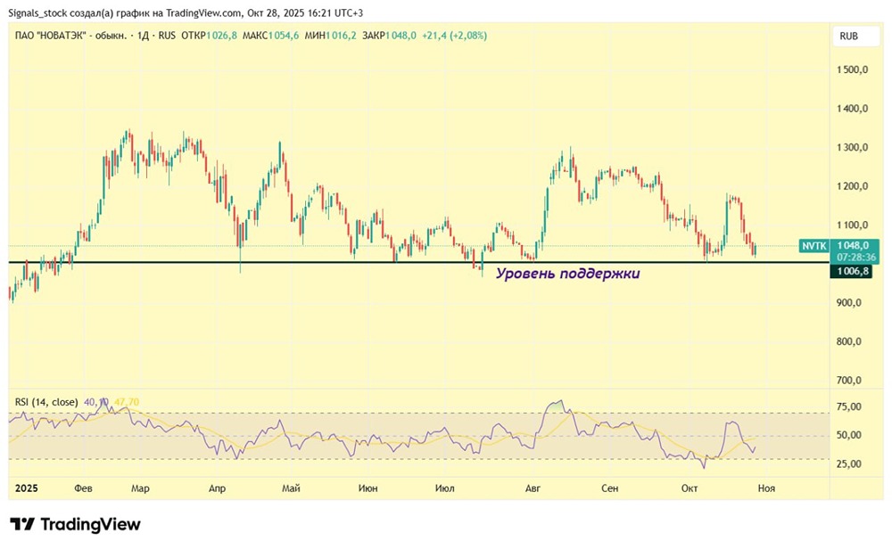 Какой уровень поддержки у акций НОВАТЭКа сейчас? Три недели назад я рекомендовал покупать акции, когда они достигли уровня поддержки. С начала года акции не опускались ниже этого значения. Шестой отскок от сильного уровня поддержки снова оказался успешным: с минимумов акции выросли на 17%. Сейчас на графике мы видим начало седьмого отскока в этом году. Все предыдущие давали рост от 10% до 30%. Даже под санкциями компания чувствует себя хорошо. Прошлый год стал рекордным по финансовым показателям. Хотя в первом полугодии 2025 года прибыль снизилась, она всё равно превысит большинство предыдущих периодов. С сентября компания активно отгружает СПГ в Китай с завода «Арктик СПГ-2», и количество танкеров продолжает расти. Bloomberg сообщает: «По данным источника, добыча природного газа на объекте в течение большей части сентября составляла в среднем 17,9 млн кубометров в сутки. Это самый высокий показатель с момента запуска в декабре 2023 года, на 14% выше предыдущего максимума, зафиксированного в августе». Эти данные положительно скажутся на отчёте за второе полугодие и станут хорошим драйвером. С текущих позиций можно рассматривать акции как для спекуляций со стопом под уровнем поддержки, так и для среднесрочных инвестиций. При текущих условиях есть большие сомнения, что акции могут упасть ниже 1000 рублей и закрепиться там. Не является индивидуальной инвестиционной рекомендацией Пост взят с соцсети [M O N D I A R A](https://i.mondiara.com/) 👉 вот ссылка на канал: https://i.mondiara.com/i/c/novatek_analytics Скачать в [App Store](https://apps.apple.com/ru/app/m-o-n-d-i-a-r-a/id6475953453) Скачать в [Google Play](https://play.google.com/store/apps/details?id=com.mondiara.app) Валюта расчёта - Ваши добрые мысли! Спасибо, что с нами! Источник: Сигналы для торговли