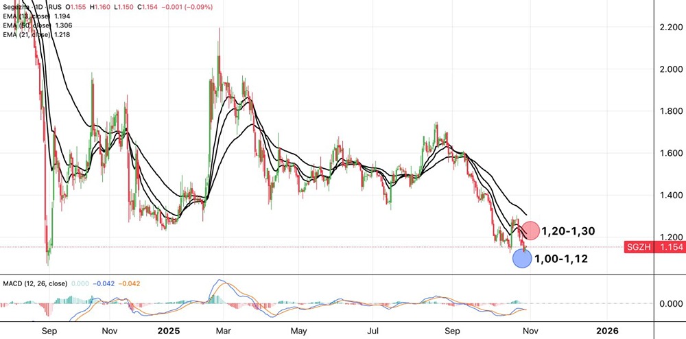 Стоит ли покупать акции «Сегежи» в 2025 году? Технический анализ акций «Сегежи» (SGZH) на текущий момент указывает на неоднозначную ситуацию. С одной стороны, есть признаки перепроданности и возможные сигналы разворота, с другой — сохраняются риски дальнейшего снижения. Рассмотрим ключевые аспекты. Текущая ситуация на графике - Поддержка и сопротивление: Акции торгуются в диапазоне ₽1,00–1,23, где ₽1,00 выступает сильной поддержкой. В октябре 2025 года цена приближалась к этому уровню, что совпадает с вашими предыдущими наблюдениями. Сопротивление расположено около ₽1,25–1,33. [```1```](https://www.tbank.ru/invest/stocks/SGZH/pulse/)[```9```](https://bcs-express.ru/tehanaliz/sgzh/01.10.25) - Индикаторы: - RSI (индекс относительной силы): В октябре 2025 года RSI находился около 30, что указывает на перепроданность. Однако в других источниках упоминается перекупленность, что может быть связано с разными временными периодами анализа. [```1```](https://www.tbank.ru/invest/stocks/SGZH/pulse/) - MACD (скользящая средняя конвергенция/дивергенция): Есть признаки разворота вверх, но сигнал не является сильным. [```1```](https://www.tbank.ru/invest/stocks/SGZH/pulse/) - Формирующиеся паттерны: На дневном графике наблюдается структура, напоминающую «треугольник» или «двойное дно», что может указывать на потенциальный разворот тренда. Однако в конце августа 2025 года произошло закрепление ниже 200-дневной скользящей средней, что ухудшило среднесрочную картину. [```1```](https://www.tbank.ru/invest/stocks/SGZH/pulse/)[```9```](https://bcs-express.ru/tehanaliz/sgzh/01.10.25) Фундаментальные факторы - Финансовые показатели: Во II квартале 2025 года OIBDA сократилась в 6 раз до ₽0,5 млрд, а чистый убыток составил ₽9,1 млрд. Выручка снизилась на 22% г/г. За первое полугодие чистый убыток вырос в 2,3 раза до ₽21,8 млрд. [```2```](https://www.interfax.ru/business/1044635)[```14```](https://bcs-express.ru/novosti-i-analitika/segezha-opublikovala-otchetnost-za-i-polugodie) - Долг: После допэмиссии в июне 2025 года чистый долг сократился до ₽58 млрд (с ₽153 млрд в марте), но соотношение чистого долга к OIBDA остаётся высоким — 22x. [```14```](https://bcs-express.ru/novosti-i-analitika/segezha-opublikovala-otchetnost-za-i-polugodie) - Внешние факторы: Слабый спрос на пиломатериалы в Китае, снижение цен на бумагу, укрепление рубля (около половины выручки приходится на экспорт). [```17```](https://smart-lab.ru/forum/SGZH) Прогнозы аналитиков - БКС Экспресс: Целевая цена на год — ₽0,8, взгляд «Негативный». Основной риск — отсутствие роста операционной прибыли. [```11```](https://bcs-express.ru/novosti-i-analitika/segezha-sostavliaem-negativnyi-vzgliad) - Альфа-Банк: Ожидается снижение процентных расходов с III квартала 2025 года, но улучшение ситуации зависит от восстановления рынков сбыта. [```10```](https://AlfaBank.ru/alfa-investor/t/segezha-otchitalas-o-slabyh-rezultatah/) - Консенсус-прогноз: Некоторые аналитики рекомендуют «Покупать», отмечая потенциал роста в долгосрочной перспективе, особенно при снижении ключевой ставки и восстановлении спроса в строительстве. [```7```](https://www.Finam.ru/publications/item/segezha-riskov-khvataet-no-est-i-svetlye-pyatna-20250901-1625/) Риски и возможности - Риски: Дальнейшее снижение спроса, рост издержек, высокая долговая нагрузка. - Возможности: Оптимизация производства, рост цен на пиломатериалы, восстановление экспорта в Китай (запасы пиломатериалов в Китае снизились). [```7```](https://www.Finam.ru/publications/item/segezha-riskov-khvataet-no-est-i-svetlye-pyatna-20250901-1625/) Рекомендации - Краткосрочно: Цена может продолжить колебаться в диапазоне ₽1,00–1,23. Пробой поддержки ₽1,00 может привести к дальнейшему снижению. - Среднесрочно: Формирование «двойного дна» или «треугольника» создаёт потенциал для роста, но т