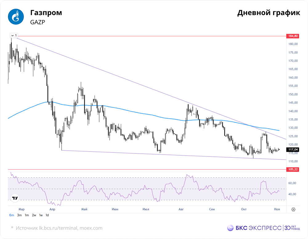 Мнение: БКС Экспресс Аналитика по акциям Газпрома Вчера акции Газпрома подорожали на 1,14% до 117,52 рублей. Объем торгов составил 2,2 миллиарда рублей. Сегодня утром бумаги подешевели на 0,49% до 116,94 рублей. Краткосрочная картина • Небольшое повышение стоимости акций в выходной день сопровождалось низким объемом торгов. Акции экспортной газопроводной монополии выросли вместе с рынком, но отступили от роста Индекса МосБиржи, который прибавил 1,5%. Эти колебания укладываются в рамки затянувшейся двухнедельной консолидации. • Закрытие прошло у 200-часовой скользящей средней цены. По итогам дня техническая картина остается умеренно позитивной. Утреннее значение индикатора относительной силы (RSI) на часовом графике показывает, что акции далеки от состояния перекупленности или перепроданности. • Сегодня акции Газпрома, вероятно, продолжат боковое движение в диапазоне 114–119,5 рублей. В течение дня возможны новые попытки преодолеть 200-часовую скользящую среднюю цену, которая сейчас находится около 117,5 рублей. Если это произойдет, краткосрочная техническая картина улучшится, что станет сигналом для дальнейших покупок. Внешний фон • Индекс S&P 500 упал на 1,17% вчера. Фьючерсы на S&P 500 сегодня утром снижаются на 0,1%. Ключевыми азиатскими индексами наблюдается разнонаправленное движение. Нефть Brent торгуется без изменений около $64,4 за баррель. Уровни сопротивления: 118,3 / 119,5 / 121 Уровни поддержки: 115 / 114,3 / 113 Долгосрочная картина • Акции Газпрома обновили многомесячный минимум и продолжают снижение ниже 200-дневной скользящей средней цены. Долгосрочная техническая картина остается негативной. • Существенный рост от текущих уровней затруднен из-за множества старых технических сопротивлений и ухудшения фундаментальных факторов, включая значительное сокращение объемов поставок в западном направлении. В 2023 году компания впервые за 25 лет зафиксировала годовой чистый убыток. Тогда Газпром отказался от выплаты дивидендов и пока не возобновил их. • По оценкам аналитиков БКС, целевая цена акций на горизонте года составляет 140 рублей, что предполагает потенциальный рост на 20% от текущего уровня. Автор: Манжос Виталий Не является индивидуальной инвестиционной рекомендацией Пост взят с соцсети [M O N D I A R A](https://i.mondiara.com/) 👉 вот ссылка на канал: https://i.mondiara.com/i/c/gazprom_analytics Скачать в [App Store](https://apps.apple.com/ru/app/m-o-n-d-i-a-r-a/id6475953453) Скачать в [Google Play](https://play.google.com/store/apps/details?id=com.mondiara.app) Валюта расчёта - Ваши добрые мысли! Спасибо, что с нами! Источник: bcs-express.ru