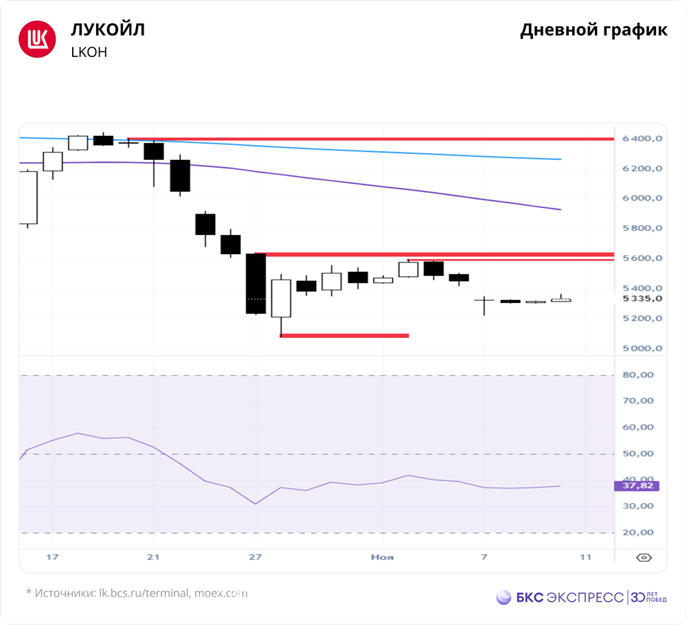 Мнение: БКС Экспресс Аналитика по акциям Лукойла Акции ЛУКОЙЛа в прошлую пятницу потеряли 2,37%, закрывшись на уровне 5324 руб. Это произошло на фоне более слабой динамики рынка. Объем торгов составил 13,76 млрд руб. Краткосрочная перспектива • В понедельник акции отскочили вместе с рынком, достигнув максимума 5365,5. Теперь ждем завершения этого движения и новой реакции продавцов. • Текущая структура рынка предполагает тестирование минимума 5077,5. Пока сопротивление на уровне 5598,5 не пробито, вероятно движение в диапазон 5065–5045. • На дневном графике RSI находится на уровне 37 п. На 4-часовом таймфрейме акции торгуются ниже 50-дневной и 200-дневной скользящих средних. Основное внимание уделяем уровням сопротивления и поддержки: 5598,5 и 5077,5. Внешний фон Индекс S&P 500 вырос на 0,09% в пятницу, утром он был в плюсе на 0,7%. Азиатские индексы торгуются в зеленой зоне. Нефть Brent прибавила 0,39% в пятницу и 0,9% с утра. Уровни сопротивления: 5598,5 / 6406 / 6444 Уровни поддержки: 5223 / 5077,5 / 5045 Долгосрочная перспектива • Акции достигли цели падения 5510. Следующие цели: 1) 5435 (достигнута) 2) 5065 3) 5000. Пока сопротивление на уровне 6406 не пробито, инициатива остается у продавцов. • Санкции влияют на акции ЛУКОЙЛа. Они затрагивают компании с долей Роснефти и ЛУКОЙЛа 50% и выше. Вероятно, под санкции попадет и Башнефть, контролируемая Роснефтью. • ЛУКОЙЛ может столкнуться с проблемами в международном трейдинге и работе НПЗ в Болгарии и Румынии. Однако точный эффект предсказать сложно. С 2023 года условия для НПЗ в этих странах ухудшились из-за эмбарго ЕС на морские поставки нефти из России. Болгария дополнительно ужесточила условия, что привело к обсуждению продажи актива. • Аналитики БКС считают акции ЛУКОЙЛа привлекательными. По показателю EV/EBITDA на 2026 год в 2,8х акции торгуются с дисконтом к историческому среднему уровню в 3,2х. Дивиденды • ЛУКОЙЛ сообщил, что заседание Совета директоров, запланированное на 23 октября 2025 года, перенесено из-за обстоятельств. Ждем решения по дивидендам. • По предварительным данным, ЛУКОЙЛ может выплатить дивиденды за первое полугодие 2025 года. Наша оценка — 352 руб. на акцию. Большинство рыночных прогнозов варьируются от 350 до 440 руб. на акцию. Автор: Мамонтов Андрей Не является индивидуальной инвестиционной рекомендацией Пост взят с соцсети [M O N D I A R A](https://i.mondiara.com/) 👉 вот ссылка на канал: https://i.mondiara.com/i/c/lukoil_analytics Скачать в [App Store](https://apps.apple.com/ru/app/m-o-n-d-i-a-r-a/id6475953453) Скачать в [Google Play](https://play.google.com/store/apps/details?id=com.mondiara.app) Валюта расчёта - Ваши добрые мысли! Спасибо, что с нами! Источник: bcs-express.ru