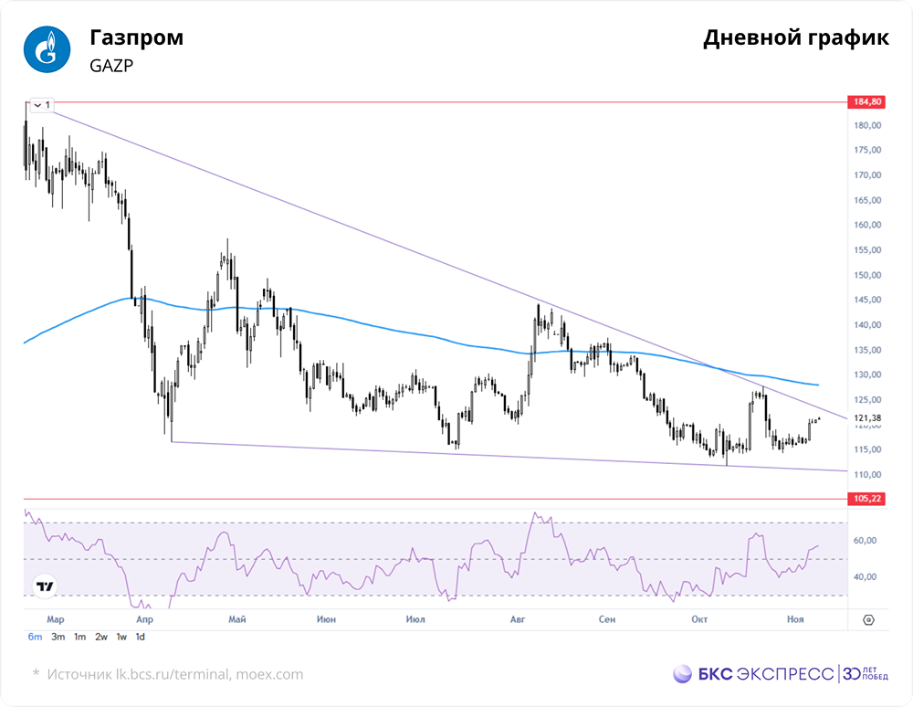 Мнение: БКС Экспресс Анализ акций Газпрома Вчера акции Газпрома выросли на 0,51% по сравнению с пятничным закрытием, достигнув 121,06 руб. Объем торгов составил 1 млрд руб. Утром бумаги прибавили 0,77%, поднявшись до 121,38 руб. Краткосрочная картина • В выходные акции Газпрома умеренно подорожали при низком торговом обороте. После выхода из двухнедельной консолидации рост замедлился, и бумаги вернулись в середину двухмесячного диапазона 112—128 руб. • Закрытие сессии прошло выше 200-часовой скользящей средней, что указывает на умеренно позитивную краткосрочную техническую картину. Высокий утренний уровень индикатора RSI на часовом графике говорит о близости к состоянию перекупленности. • Сегодня акции Газпрома могут попытаться подняться до 122–124 руб. Снижение темпов роста в пятницу свидетельствует об осторожности покупателей, поэтому достижение этого уровня может занять несколько дней. Внешний фон • Индекс S&P 500 в пятницу вырос на 0,13%. Фьючерсы на S&P 500 утром поднялись на 0,7%. Основные азиатские фондовые индексы показали смешанную динамику. Нефть Brent подорожала на 0,6%, достигнув $64,1 за баррель. Уровни сопротивления: 122/124/126 Уровни поддержки: 119,6/118,6/117,5 Долгосрочная картина • Акции Газпрома недавно обновили многолетний минимум и продолжают движение ниже 200-дневной скользящей средней. Долгосрочная техническая картина остается негативной. • Значительный рост от текущих уровней затруднен множеством старых технических сопротивлений и ухудшением фундаментальных факторов, таких как значительное сокращение объемов поставок в западном направлении. В 2023 году Газпром впервые за 25 лет получил годовой чистый убыток. Тогда компания отказалась от выплаты дивидендов и пока не возобновила их. • Целевая цена акций на горизонте года, по оценкам аналитиков БКС, составляет 140 руб., что предполагает потенциальный рост на 16% от текущего уровня. Автор: Манжос Виталий Не является индивидуальной инвестиционной рекомендацией Пост взят с соцсети [M O N D I A R A](https://i.mondiara.com/) 👉 вот ссылка на канал: https://i.mondiara.com/i/c/gazprom_analytics Скачать в [App Store](https://apps.apple.com/ru/app/m-o-n-d-i-a-r-a/id6475953453) Скачать в [Google Play](https://play.google.com/store/apps/details?id=com.mondiara.app) Валюта расчёта - Ваши добрые мысли! Спасибо, что с нами! Источник: bcs-express.ru
