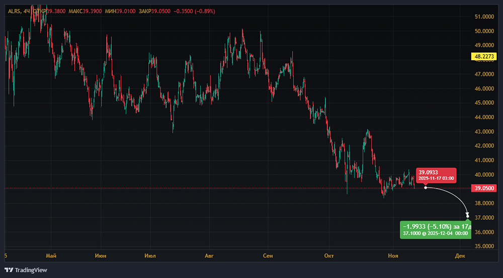 Мнение: Альфа-Инвестиции Торговый план по акциям АЛРОСА • Продажа: акций АЛРОСА по цене не ниже 39,1 руб. • Срок: до двух месяцев • Цель: 37,1 руб. • Потенциальная доходность: до 5%. Почему акции могут упасть? Циклический спад отрасли. Алмазный рынок переживает длительный спад. Избыток запасов у переработчиков и снижение потребительского спроса продолжают оказывать давление на цены и объёмы продаж, ограничивая потенциал восстановления. Слабые финансовые результаты. По итогам первого полугодия 2025 года выручка компании упала на 25% по сравнению с предыдущим годом, EBITDA снизилась на 42%, а свободный денежный поток почти обнулился. Рост капитальных затрат. АЛРОСА предстоит восстановить рудник «Мир», на что потребуется 1,8–2 миллиарда долларов. Компания также приобрела золоторудное месторождение Дегдекан, которое необходимо разрабатывать. Это серьёзная нагрузка на свободный денежный поток, что может ограничить дивиденды. Не забываем о рисках • Улучшение внешней ситуации и начало общерыночного роста могут положительно сказаться на акциях АЛРОСА. • Рост мировых цен на алмазы приведёт к увеличению стоимости акций компании. • Формируя спекулятивную короткую позицию (шорт), мы рекомендуем выставить защитный стоп-приказ на уровне 40,8 рубля для контроля риска. Не является индивидуальной инвестиционной рекомендацией Пост взят с соцсети [M O N D I A R A](https://i.mondiara.com/) 👉 вот ссылка на канал: https://i.mondiara.com/i/c/alrosa_analytics Скачать в [App Store](https://apps.apple.com/ru/app/m-o-n-d-i-a-r-a/id6475953453) Скачать в [Google Play](https://play.google.com/store/apps/details?id=com.mondiara.app) Валюта расчёта - Ваши добрые мысли! Спасибо, что с нами! Источник: alfabank.ru