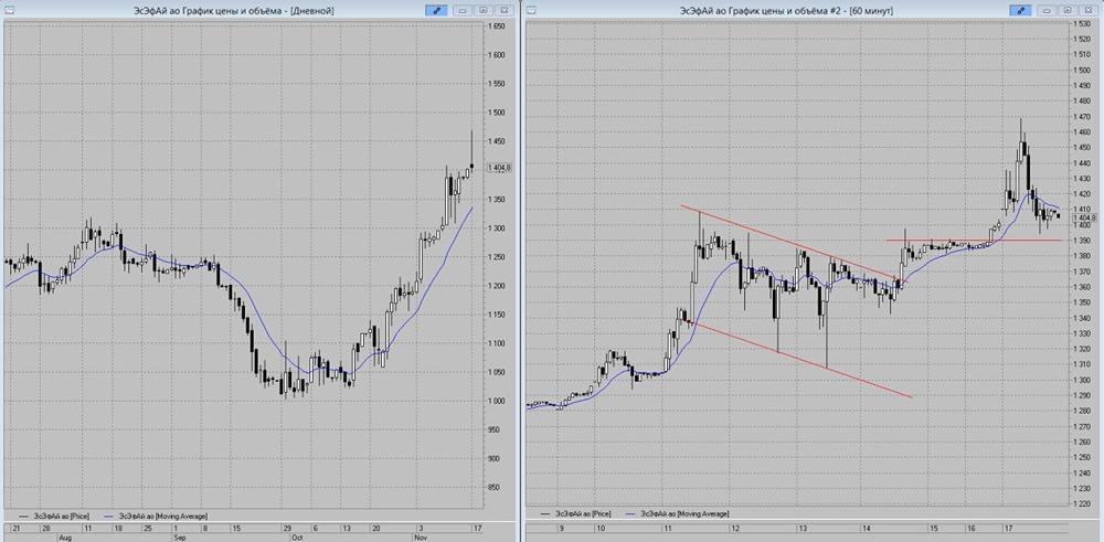 Какие сигналы дают индикаторы по акциям ЭсЭфАй? Акции «ЭсЭфАй» в понедельник полностью реализовали потенциал конструкции «Флаг», о которой шла речь в посте за 13 ноября. Текущая дневная свеча в виде медвежьей модели «Перевёрнутый молот», а также концентрация под линией часового индикатора МА-13, вместе, способствуют дальнейшей коррекции к цене 1390 руб., которую пока рассматриваю ближайшей целью на вторник. Там же проходит часовой уровень поддержки, который, скорее всего, будет сравнительно быстро пробит. Что далее откроет котировкам возможность для более глубокого снижения с целью около линии дневного индикатора МА-13, который выступает среднесрочной поддержкой. Внутри часовой концентрации есть сигнал на продажу. Со стоп-лоссом на цене 1415 руб. Фиксацию прибыли лучше начинать с цены 1390 руб. и выше. Не является индивидуальной инвестиционной рекомендацией Пост взят с соцсети [M O N D I A R A](https://i.mondiara.com/) 👉 вот ссылка на канал: https://i.mondiara.com/i/c/sfi_analytics Скачать в [App Store](https://apps.apple.com/ru/app/m-o-n-d-i-a-r-a/id6475953453) Скачать в [Google Play](https://play.google.com/store/apps/details?id=com.mondiara.app) Валюта расчёта - Ваши добрые мысли! Спасибо, что с нами! Источник: Тех.Анализ