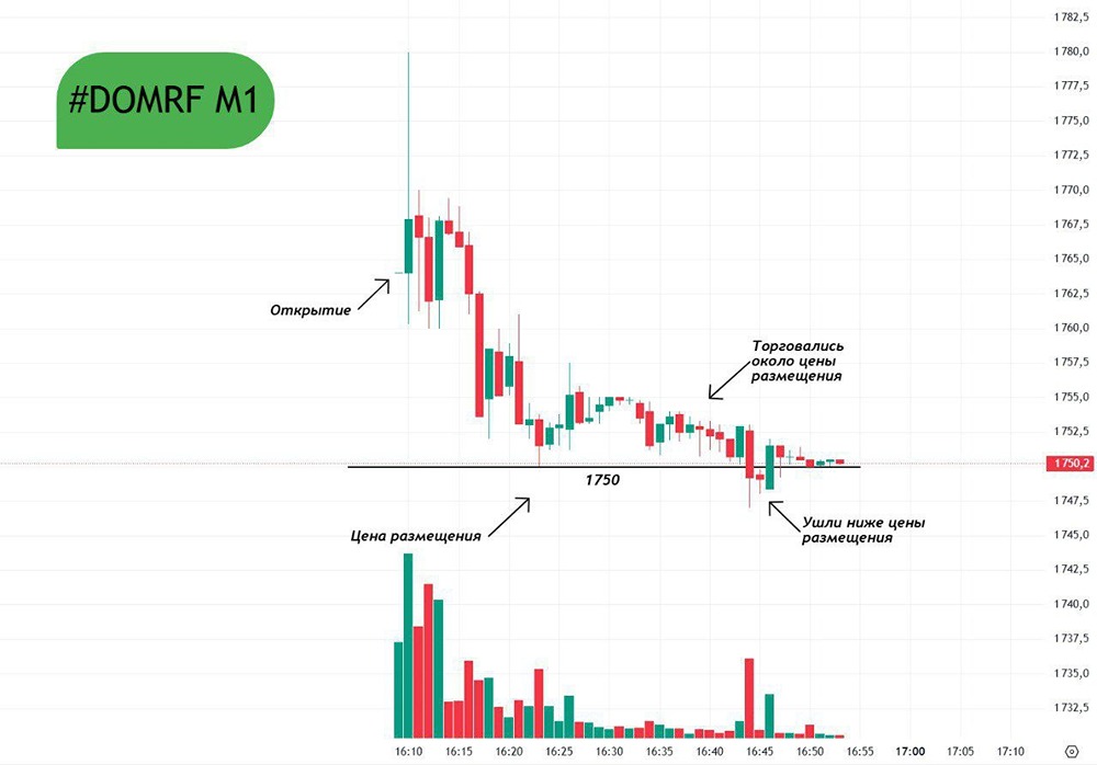 Почему IPO Дом.РФ не оправдало ожиданий инвесторов? На открытии торгов акциями «Дом.РФ» мы увидели в моменте рост на +1,72%. После этого котировки начали сползать вниз, дойдя до уровня размещения (1750). Далее на протяжении 21 минуты мы торговались около цены IPO и в 16:44 (мск) ушли ниже цены IPO. Сейчас же, спустя 55 минут после размещения, акции также торгуются около уровня 1750. По итогу, несмотря на переподписку книги заявок в 4-5 раз, большого роста в этом IPO мы не увидели. Не является индивидуальной инвестиционной рекомендацией Пост взят с соцсети [M O N D I A R A](https://i.mondiara.com/) 👉 вот ссылка на канал: https://i.mondiara.com/i/c/bank_dom.rf_analytics Скачать в [App Store](https://apps.apple.com/ru/app/m-o-n-d-i-a-r-a/id6475953453) Скачать в [Google Play](https://play.google.com/store/apps/details?id=com.mondiara.app) Валюта расчёта - Ваши добрые мысли! Спасибо, что с нами! Источник: Трейдинг с Артёмом