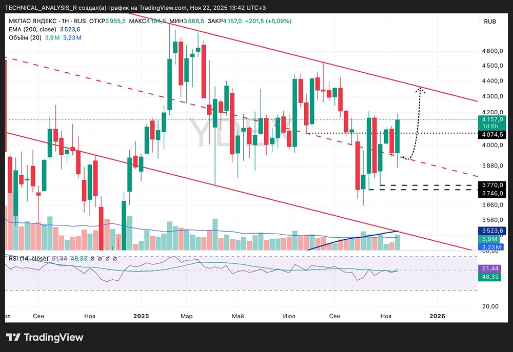 Пробьёт ли Яндекс верхнюю границу канала — какие шансы на рост к 4300? Цена по Яндексу делает аккуратный отскок от зоны 3770-3746 и снова возвращается в середину канала. Тут ничего удивительного — покупатели защищают уровень, как и раньше. Объёмы растут, RSI поднимается выше 50 — значит, рынок начинает оживать. Сейчас ближайшая цель по технической картине выглядит в районе 4200-4300. Это верхняя граница локального диапазона и линия нисходящего канала. Если дойдут туда — это уже будет движение примерно +4-6%. Но важно понимать: пока цена остаётся внутри красного нисходящего канала, глобального разворота нет. Это просто фазовый отскок внутри тренда. Вероятность роста есть, процентов на 60 — но вверх Яндекс будет идти ступенчато, и ближайшее сопротивление уже рядом. Если пробьют — откроется путь к 4400. Кратко: отскок есть, импульс есть, но это всё ещё игра внутри канала. Не является индивидуальной инвестиционной рекомендацией Пост взят с соцсети [M O N D I A R A](https://i.mondiara.com/) 👉 вот ссылка на канал: https://i.mondiara.com/i/c/yandex_analytics Скачать в [App Store](https://apps.apple.com/ru/app/m-o-n-d-i-a-r-a/id6475953453) Скачать в [Google Play](https://play.google.com/store/apps/details?id=com.mondiara.app) Валюта расчёта - Ваши добрые мысли! Спасибо, что с нами! Источник: Капибара на Бирже