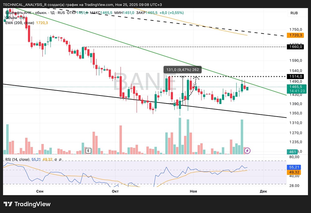 Стоит ли покупать Башнефть на текущих уровнях? Цена успешно отскочила от нижней границы канала. Рост составил почти 10% — сценарий сработал. Сейчас актив тестирует важный нисходящий трендовый уровень. Индекс относительной силы (RSI) превысил отметку 50, что указывает на восстановление спроса. Объёмы торгов растут, подтверждая интерес к бумаге. Основное сопротивление находится на уровне 1514. Преодоление этого барьера откроет путь к дальнейшему росту. Если цена пробьёт нисходящую трендовую линию и удержится выше, рынок может выйти из фазы коррекции и начать движение вверх. Без закрепления выше уровня существует риск отката к локальным зонам поддержки. Общая картина остаётся позитивной. Закрепление выше 1514 станет мощным сигналом для продолжения роста и сохранит потенциал для дальнейшего движения вверх. Не является индивидуальной инвестиционной рекомендацией Пост взят с соцсети [M O N D I A R A](https://i.mondiara.com/) 👉 вот ссылка на канал: https://i.mondiara.com/i/c/bashneft_analytics Скачать в [App Store](https://apps.apple.com/ru/app/m-o-n-d-i-a-r-a/id6475953453) Скачать в [Google Play](https://play.google.com/store/apps/details?id=com.mondiara.app) Валюта расчёта - Ваши добрые мысли! Спасибо, что с нами! Источник: Инвестиции в будущее