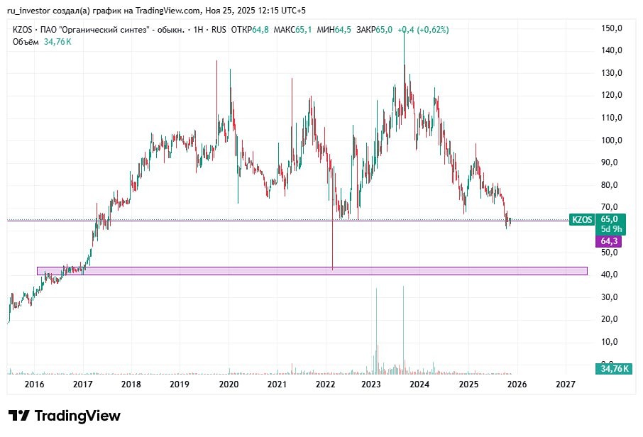 Какие перспективы у акций Казаньоргсинтез после неудачного роста: когда ждать разворота? Поскольку делать в этой бумаге нечего. В рост она не смогла, так что сейчас дорога одна — на отработку шипа и проторговку зоны поддержки. Только там можно думать о каком-то долгосрочном торговом решении. • Целевой диапазон разворота/покупки 41. • Цели в долгосроке: 65, 90, 120. Не является индивидуальной инвестиционной рекомендацией Пост взят с соцсети [M O N D I A R A](https://i.mondiara.com/) 👉 вот ссылка на канал: https://i.mondiara.com/i/c/kazorgsintez_analytics Скачать в [App Store](https://apps.apple.com/ru/app/m-o-n-d-i-a-r-a/id6475953453) Скачать в [Google Play](https://play.google.com/store/apps/details?id=com.mondiara.app) Валюта расчёта - Ваши добрые мысли! Спасибо, что с нами! Источник: Хроники Инвестора
