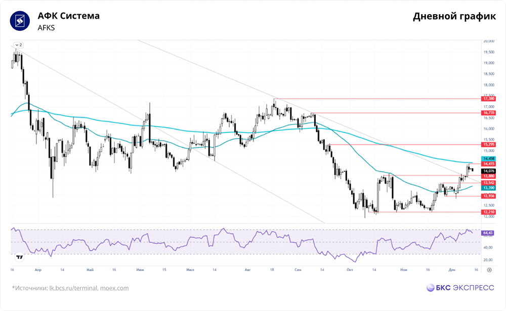 Мнение: БКС Экспресс Прогноз по акциям АФК Системы В пятницу акции АФК «Система» подешевели на 0,72%, закрывшись на уровне 14,167 руб. Объем торгов составил 1,09 млрд руб. В начале дня акции выросли на 0,9%. Краткосрочная перспектива В пятницу акции АФК «Система» снизились на фоне умеренной активности. Большинство российских бумаг также показали негативную динамику. Индекс МосБиржи упал на 0,34% в ходе основной сессии и на 1,52% за весь день. Акции «Системы» сначала выросли в первый час торгов, но вскоре начали снижаться. В течение дня они демонстрировали нисходящую динамику, и только в конце вечерней сессии немного выросли. По итогам дня сформировалась свеча, похожая на «доджи». В условиях восходящего тренда ее можно рассматривать как локальную коррекцию. В четверг акции пробили скорректированный нисходящий тренд от мая 2024 года, но в пятницу откатились от 200-дневной скользящей средней. Общая динамика остается позитивной, но перед новым ростом акции, вероятно, немного скорректируются. Ближайшей целью на разворот после коррекции может стать область около 13,88 руб., где находится статичная поддержка и предыдущий нисходящий тренд. Индекс МосБиржи также откатился от 200-дневной скользящей средней, но общая картина остается позитивной. В ближайшие дни индекс может опуститься до уровня 2700 пунктов, где расположена ближайшая поддержка. Внешний фон S&P 500 в пятницу снизился на 1,07%, а фьючерс на этот индекс с утра вырос на 0,3%. Индексы азиатских стран двигаются разнонаправленно. Фьючерс на Brent на Мосбирже в пятницу упал на 0,34%, но на мировых площадках нефть выросла на 0,3% и торгуется по цене $61,2 за баррель. Уровни сопротивления: 14,41 / 15,29 / 16,73 Уровни поддержки: 13,88 / 13,54 / 12,94 Долгосрочная перспектива Глобальная динамика акций АФК «Система» определяется пологим восходящим трендом, начавшимся осенью 2008 года. Также можно выделить тренд от декабря 2014 года, который поддерживал котировки в 2018 и 2022 годах. В 2024 году акции не достигли этого уровня, который сейчас находится около 11,6 руб. С июля 2014 года акции движутся в долгосрочном нисходящем тренде. С исторического максимума они потеряли 71%. Нисходящий тренд от мая 2024 года был преодолен, но восходящая динамика во второй половине лета оказалась неустойчивой, и тренд был скорректирован. На прошлой неделе он был пробит, но 200-дневная скользящая средняя пока не преодолена. Картина на недельных свечах улучшилась. Акции растут четыре недели подряд, а на прошлой неделе достигли двухмесячных максимумов. На младших таймфреймах есть сигналы к локальному откату, но среднесрочная перспектива остается оптимистичной. Аналитики БКС оценивают акции АФК «Система» как «нейтральные» и прогнозируют целевую цену на горизонте 12 месяцев в размере 17 руб. Автор: Решетников Олег Не является индивидуальной инвестиционной рекомендацией Пост взят с соцсети [M O N D I A R A](https://i.mondiara.com/) 👉 вот ссылка на канал: https://i.mondiara.com/i/c/afk_sistema_analytics Скачать в [App Store](https://apps.apple.com/ru/app/m-o-n-d-i-a-r-a/id6475953453) Скачать в [Google Play](https://play.google.com/store/apps/details?id=com.mondiara.app) Валюта расчёта - Ваши добрые мысли! Спасибо, что с нами! Источник: bcs-express.ru