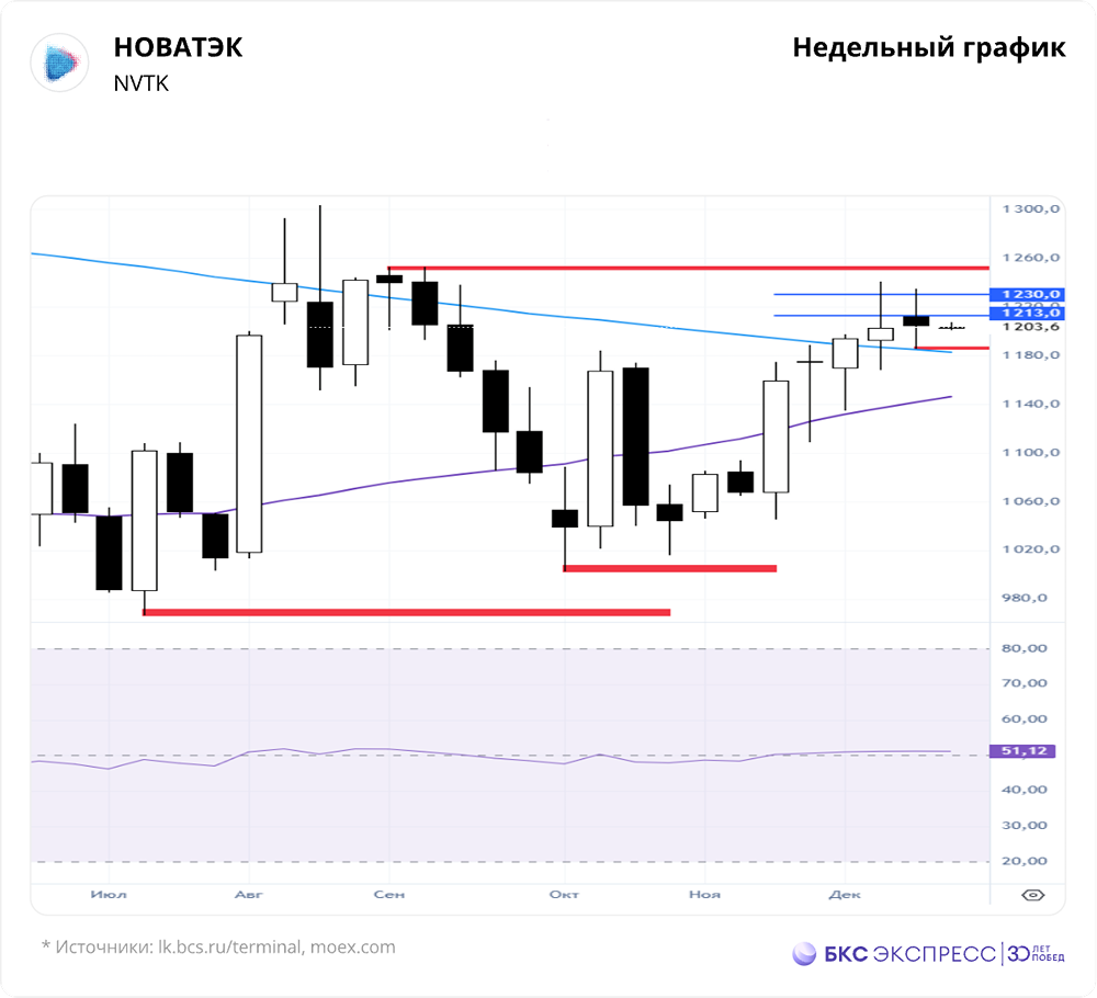 Мнение: БКС Экспресс Прогноз по акциям НОВАТЭКа Акции НОВАТЭКа упали на 0,08% на прошлой торговой сессии, закрывшись на уровне 1205 руб. Бумаги показали лучшие результаты по сравнению с рынком, а объем торгов достиг 14,75 млрд руб. Краткосрочная перспектива • В пятницу акции преодолели нижнюю границу диапазона 1201,2–1240,6, что стало первым сигналом к коррекции — пробой уровня поддержки 1201,2. Текущий минимум зафиксирован на отметке 1185,2. • Для дальнейшего снижения к уровням 1166–1143 необходимо преодолеть минимум 1185,2. Падение будет актуальным до тех пор, пока не будет сломлен уровень сопротивления 1234,6. • На дневном графике RSI находится на уровне 56 пунктов. На 4-часовом таймфрейме акции торгуются между 50- и 200-дневной скользящими средними. Основное внимание следует уделять уровням сопротивления и поддержки: 1234,6 и 1201,2. Внешний фон • Индекс S&P 500 вырос на 0,83% в пятницу и на 0,2% с утра. Индексы АТР демонстрируют положительную динамику. Нефть Brent увеличилась на 1,09% в пятницу и на 0,9% с утра. Уровни сопротивления: 1234,6 / 1240,6 / 1253 Уровни поддержки: 1185,2 / 1134,8 / 1045 Долгосрочная перспектива • Импульс роста, начавшийся с минимума 1045, пока не завершен. Следующая зона роста — 1213–1230. Контроль остается за покупателями до тех пор, пока не будет пробит уровень поддержки 1185,2. • Долгосрочные цели движения определены в краткосрочной перспективе. В долгосрочной перспективе важно следить за значением недельной свечи, сформированной в пятницу. • Мы сохраняем «нейтральный» взгляд на акции НОВАТЭКа. Бумаги торгуются с P/E 8,6x на основе наших прогнозов прибыли на 2026 год, что на 14% ниже 10-летней средней. Дивиденды • Реестр акционеров закрылся 6 октября 2025 года. Размер выплат составил 35,5 руб. на акцию, что соответствует дивидендной доходности 3,2%. • Ожидается, что вклад проекта «Арктик СПГ – 2» в дивиденды НОВАТЭКа за 2026 год составит до 20 руб. на акцию. Общая выплата за год должна достичь 82 руб. Работа над проектами «Мурманский СПГ» и «Обский СПГ» продолжается, но решения об инвестициях пока не приняты. Автор: Мамонтов Андрей Не является индивидуальной инвестиционной рекомендацией Пост взят с соцсети [M O N D I A R A](https://i.mondiara.com/) 👉 вот ссылка на канал: https://i.mondiara.com/i/c/novatek_analytics Скачать в [App Store](https://apps.apple.com/ru/app/m-o-n-d-i-a-r-a/id6475953453) Скачать в [Google Play](https://play.google.com/store/apps/details?id=com.mondiara.app) Валюта расчёта - Ваши добрые мысли! Спасибо, что с нами! Источник: bcs-express.ru