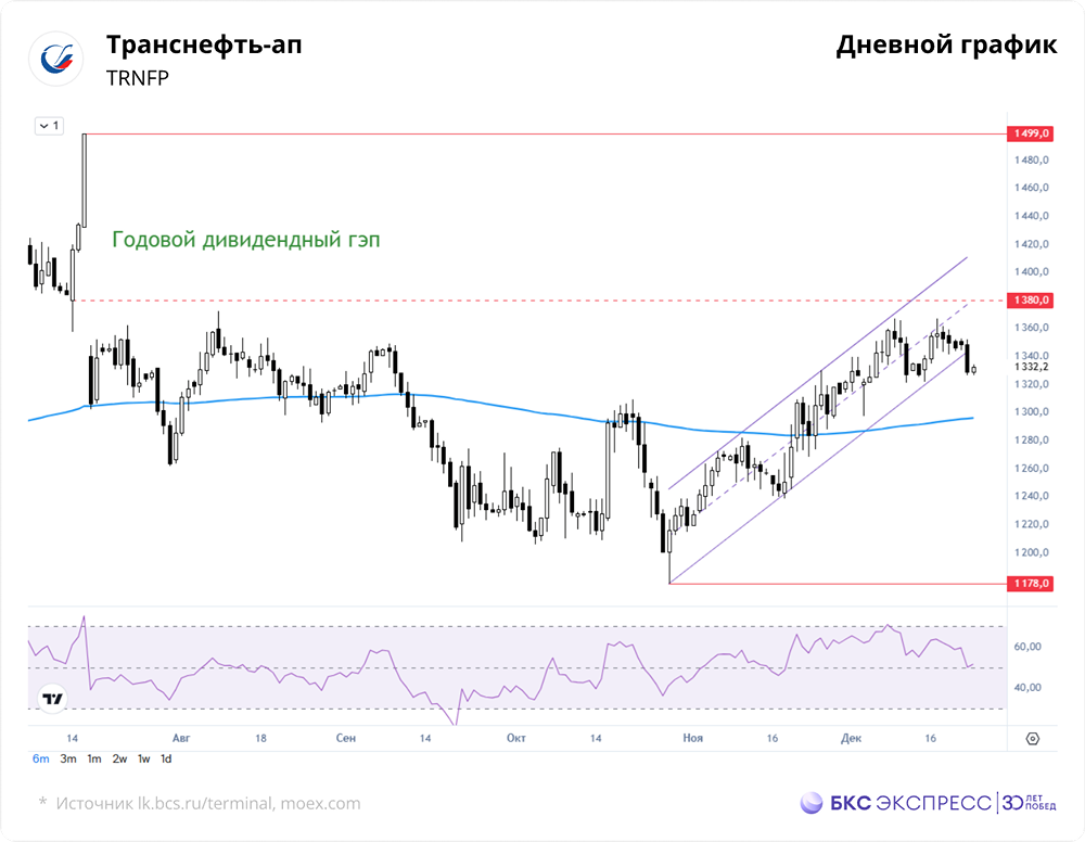 Мнение: БКС Экспресс Анализ акций Транснефти Вчера акции «Транснефти» подешевели на 1,56% до 1328,8 руб. Объем торгов составил 0,6 млрд руб. На утренней сессии бумаги выросли на 0,2%, до 1331,4 руб. Краткосрочная картина • Стоимость акций снизилась на фоне среднего торгового оборота. Распродажи были вызваны общим ухудшением рыночных настроений, но акции выглядели слабее Индекса МосБиржи, который потерял 1%. Техническая поддержка снова встретилась на уровне 1320 руб. На дневном графике виден спад двухмесячного роста после достижения среднесрочной цели. • Закрытие сессии прошло ниже 200-часовой скользящей средней. Техническая картина на краткосрочном горизонте негативная. Умеренно низкий утренний RSI на часовом графике показывает, что акции вышли из состояния перепроданности. • В ближайшие дни возможен стабилизационный период вокруг текущего уровня. Акции могут удерживаться в диапазоне 1300–1380 руб. Верхняя граница коридора представляет собой серьезное сопротивление. Внешний фон Индекс S&P 500 вырос на 0,64% накануне. Утром фьючерсы на S&P 500 снижаются на 0,1%. Ключевые азиатские индексы демонстрируют разнонаправленные движения. Нефть Brent дешевеет на 0,3%, до 61,9 за баррель. Уровни сопротивления: 1350, 1367, 1380 Уровни поддержки: 1320, 1308, 1300 Долгосрочная картина • После дробления привилегированные акции «Транснефти» продолжают движение в средней части двадцатилетнего диапазона. Существенный рост от текущего уровня затруднен из-за множества старых технических сопротивлений. • В конце ноября акции уверенно превысили 200-дневную скользящую среднюю. Долгосрочная техническая картина остается нейтральной, учитывая широкий диапазон. • Целевая цена аналитиков БКС на год — 1800 руб., что предполагает потенциальный рост на 35% от текущих уровней. Автор: Манжос Виталий Не является индивидуальной инвестиционной рекомендацией Пост взят с соцсети [M O N D I A R A](https://i.mondiara.com/) 👉 вот ссылка на канал: https://i.mondiara.com/i/c/transneft_analytics Скачать в [App Store](https://apps.apple.com/ru/app/m-o-n-d-i-a-r-a/id6475953453) Скачать в [Google Play](https://play.google.com/store/apps/details?id=com.mondiara.app) Валюта расчёта - Ваши добрые мысли! Спасибо, что с нами! Источник: bcs-express.ru