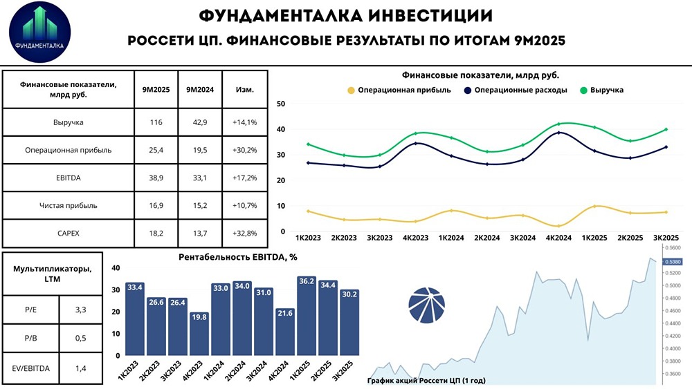 Россети Центр и Приволжье: обновляем взгляд Друзья, последний обзор в уходящем году посвящён крупнейшей энергетической компании Центральной России — Россети Центр и Приволжье. Посмотрим, как компания показала себя за 9 месяцев 2025 года и стоит ли держать её акции: - Выручка: 116 млрд руб. (+14,1% г/г) - EBITDA: 38,9 млрд руб. (+17,2% г/г) - Чистая прибыль: 16,9 млрд руб. (+10,7% г/г) Выручка Россети ЦиП за 9 месяцев 2025 года выросла на 14,1% до 116 млрд рублей. Это произошло благодаря увеличению объема услуг, росту тарифов и выполнению крупных контрактов. EBITDA выросла на 17,2% до 38,9 млрд рублей, а чистая прибыль — на 10,7% до 16,9 млрд рублей. Выручка от передачи электроэнергии увеличилась на 12,3%, от технологического присоединения — на 23,3%, а прочая выручка — на 48,4%. Тарифы были проиндексированы на 11,5% с 1 июля 2025 года. Операционные расходы выросли с 84 до 93,2 млрд рублей, операционная прибыль — с 19,5 до 24,5 млрд рублей. Финансовые расходы составили 4,8 млрд рублей против 4,3 млрд рублей годом ранее. Чистая денежная позиция увеличилась с 21,2 до 25,4 млрд рублей, чистый долг снизился до 7,3 млрд рублей при ND/EBITDA на уровне 0,15x. Финансовое состояние компании остаётся стабильным. Свободный денежный поток (FCF) за 9 месяцев 2025 года составил 5,7 млрд рублей, капитальные затраты выросли с 13,7 до 18,2 млрд рублей. Дивиденды Дивидендная политика Россети ЦиП предполагает выплаты в размере 50% от чистой прибыли, рассчитанной по РСБУ или МСФО (в зависимости от того, какая из них выше). Чистая прибыль может корректироваться на обязательные отчисления, инвестиции и погашение убытков прошлых лет. За 9 месяцев 2025 года компания заработала 16,9 млрд рублей из прогнозируемых 18,2 млрд. Если прогнозы оправдаются, дивидендная база за 2025 год составит около 9,1 млрд рублей. Это может привести к дивиденду около 0,0807469 рублей на акцию, что соответствует дивдоходности 15,8%. Однако в последнее время компания платила около 35% чистой прибыли в виде дивидендов. Если тенденция сохранится, дивдоходность может составить около 11%. Итог С момента моего предыдущего обзора (08.07.2025) акции Россети ЦиП выросли на 28,7% и превысили целевой уровень в 50 копеек. Поздравляю всех, кто купил или держал эти акции! Финансовые результаты компании за 9 месяцев остаются устойчивыми. Ключевые направления бизнеса демонстрируют хорошие показатели, маржинальность составляет 30,2%, а годовой прогноз по выручке и прибыли может быть выполнен. Индексация тарифов также способствует улучшению финансовых результатов в четвёртом квартале 2025 года. Однако есть и негативные моменты. Компания фиксирует рост операционных расходов, особенно на зарплаты. Крупная инвестиционная программа и снижение ключевой ставки могут оказать давление на финансовые показатели. Несмотря на эти нюансы, Россети ЦиП остаётся одной из ключевых дивидендных акций на рынке. Проблем с долгом нет, а будущие дивиденды будут расти. Моё мнение о компании не изменилось. Россети ЦиП — это хороший и предсказуемый долгосрочный актив. Я повышаю долгосрочный таргет с 0,5 до 0,7 рублей за акцию. Не является индивидуальной инвестиционной рекомендацией Пост взят с соцсети [M O N D I A R A](https://i.mondiara.com/) 👉 вот ссылка на канал: https://i.mondiara.com/i/c/rosseti_analytics Скачать в [App Store](https://apps.apple.com/ru/app/m-o-n-d-i-a-r-a/id6475953453) Скачать в [Google Play](https://play.google.com/store/apps/details?id=com.mondiara.app) Валюта расчёта - Ваши добрые мысли! Спасибо, что с нами! Источник: Фунда