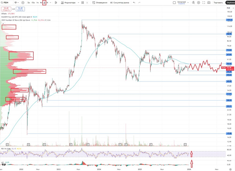 Аналитика по компании ДВМП Сектор: транспорт, логистика, перевозки. Последний обзор по ДВМП я делал 18 сентября, когда акции стоили 58,8 рублей. Я ожидал боковик в диапазоне 48-73 рублей. Однако с тех пор акции компании находятся в более узком коридоре 46-56 рублей. Основные метрики - Капитализация: 1,99 млрд долларов. - P/E: 6,06. - P/S: 0,81. - P/B: 1,03. - EPS: 8,76 рублей. - EBITDA: 53,9 млрд рублей. - EV/EBITDA: 3,07. По сравнению с прошлым обзором акции немного подешевели, а свежий отчет пока не опубликован. Новостной фон - Контейнерный рынок России снизился на 5,2% за 11 месяцев — Fesco. - FESCO запустила первый прямой железнодорожный сервис из Китая в Санкт-Петербург. - Готовятся переговоры о продаже доли в FESCO арабской компании DP World. - ЕС ввел санкции против ДВМП (23 октября). - Fesco получила в управление морской порт и пароходство на Камчатке. Финансовое здоровье - Собственный капитал сократился на 10% за первое полугодие 2025 года. - Чистый долг снизился на 35%. - Net Debt / EBITDA — 0,28, что свидетельствует о незначительных долгах. Ситуация ухудшилась, но финансовое положение компании остается стабильным. Однако текущая динамика может ослабить компанию. Выручка и прибыль - Выручка за первое полугодие 2025 года выросла на 5%. - Прибыль упала на 4%. - Свободный денежный поток вырос на 50%. Будущее и оценки 18 сентября АКБФ Инвестиции установили целевой уровень цены в 82,42 рубля. Основные акционеры - Enviartia Consulting: 25%. - Smartilicious Consulting: 25%. Сравнение с конкурентами В секторе всего две компании, поэтому сравнивать можно только с Совкомфлотом. По капитализации ДВМП уступает, но по прибыльности и другим метрикам выглядит более привлекательно. В сравнении с рентабельностью Совкомфлота, ДВМП значительно лучше. В целом, по большинству метрик ДВМП превосходит главного конкурента. В секторе «Транспорт» компания оценивается дороже, но ее долговая нагрузка и рентабельность ниже средней по сектору. При этом рост выручки за последние пять лет превышает показатели сектора. Дивиденды Компания не выплачивает дивиденды. Технический анализ Как и в прошлом обзоре, я ожидаю боковик. Все свои мысли я отразил на графике. Выводы Пока геополитическая ситуация не улучшится, ожидать позитивных изменений не стоит. В этом году контейнерные перевозки снизились на 5-6%, и следующий отчет, вероятно, покажет аналогичное снижение выручки. Не является индивидуальной инвестиционной рекомендацией Пост взят с соцсети [M O N D I A R A](https://i.mondiara.com/) 👉 вот ссылка на канал: https://i.mondiara.com/i/c/fesco_analytics Скачать в [App Store](https://apps.apple.com/ru/app/m-o-n-d-i-a-r-a/id6475953453) Скачать в [Google Play](https://play.google.com/store/apps/details?id=com.mondiara.app) Валюта расчёта - Ваши добрые мысли! Спасибо, что с нами!