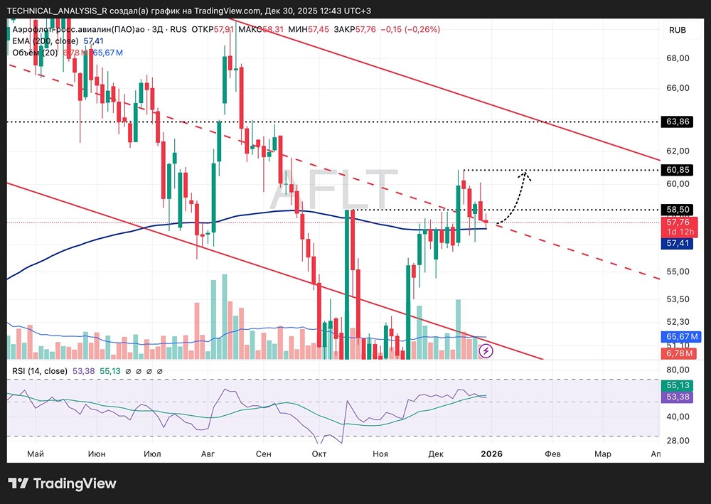 Какие факторы поддерживают акции «Аэрофлота» сейчас? Сильная зона поддержки сформирована сразу тремя факторами: середина нисходящего канала, ЕМА200 и RSI у зоны 50. Пока цена держится выше 57,4, сценарий роста в силе. Ожидаю отскок и движение к 60,8 — там ближайшее сопротивление. Потенциал около 5%. Объёмы пока средние, без паники. Похоже на техкоррекцию после пробоя трендовой. Если поддержку не удержат и уйдут ниже 57, рост поставят под вопрос и вернутся к 56. Не является индивидуальной инвестиционной рекомендацией Пост взят с соцсети [M O N D I A R A](https://i.mondiara.com/) 👉 вот ссылка на канал: https://i.mondiara.com/i/c/aeroflot_analytics Скачать в [App Store](https://apps.apple.com/ru/app/m-o-n-d-i-a-r-a/id6475953453) Скачать в [Google Play](https://play.google.com/store/apps/details?id=com.mondiara.app) Валюта расчёта - Ваши добрые мысли! Спасибо, что с нами! Источник: Капибара на Бирже