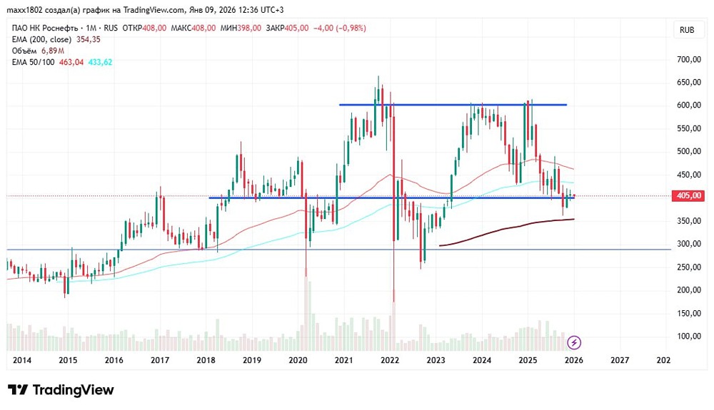 Стоит ли покупать Роснефть на уровне 400 рублей в 2026 году? Разбор графика Тайм фрейм месяц Весь ушедший год акции компании находились под давлением, и цена на них неуклонно шла вниз, пока не достигла своей сильной поддержки на уровне 400, именно от данной поддержки она и была добавлена в портфель. Но в октябре, когда вышли сильно негативные новости, данная поддержка была пробита, и цена ушла на минимумы года, правда, задержалась она там недолго, и её быстро откупили. Тайм фрейм год В целом же, год компания закрывает падением более чем на 32%, и такое закрытие подразумевает под собой дальнейшее движение цены вниз. Для нас следующим хорошим уровнем для увеличения позиции послужит отметка 290, именно там проходит ещё одна сильная поддержка, и именно там я буду увеличивать позицию. Пока же цена пытается цепляться за уровень 400. Не является индивидуальной инвестиционной рекомендацией Пост взят с соцсети [M O N D I A R A](https://i.mondiara.com/) 👉 вот ссылка на канал: https://i.mondiara.com/i/c/rosneft_analytics Скачать в [App Store](https://apps.apple.com/ru/app/m-o-n-d-i-a-r-a/id6475953453) Скачать в [Google Play](https://play.google.com/store/apps/details?id=com.mondiara.app) Валюта расчёта - Ваши добрые мысли! Спасибо, что с нами! Источник: Инвестируем Выгодно