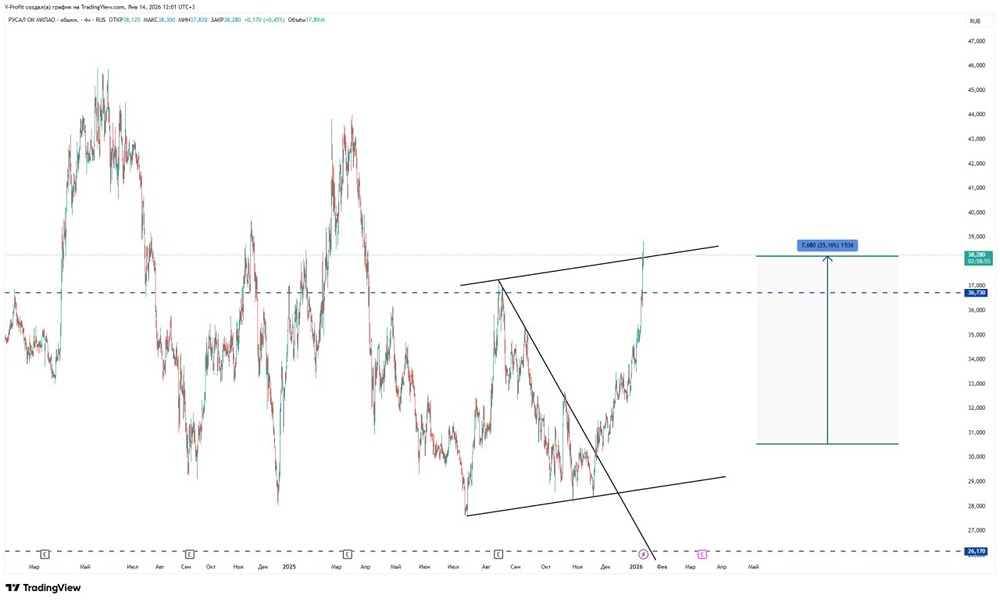 Технический анализ акций Русал: сформируется ли боковик? Акции дошли до цели 36,7, но пошли выше, и всего цена выросла на 25%. Сейчас есть попытка сформировать наклонный боковик, но пока разворота вниз нет, и нужно понаблюдать. Не является индивидуальной инвестиционной рекомендацией Пост взят с соцсети [M O N D I A R A](https://i.mondiara.com/) 👉 вот ссылка на канал: https://i.mondiara.com/i/c/rusal_analytics Скачать в [App Store](https://apps.apple.com/ru/app/m-o-n-d-i-a-r-a/id6475953453) Скачать в [Google Play](https://play.google.com/store/apps/details?id=com.mondiara.app) Валюта расчёта - Ваши добрые мысли! Спасибо, что с нами! Источник: Восходящий тренд
