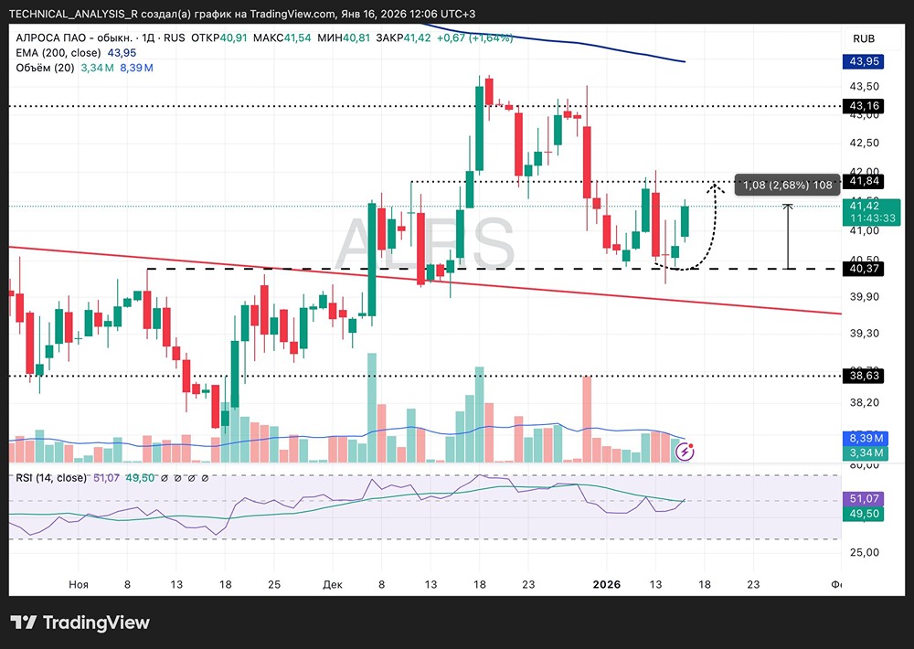 АЛРОСА: сценарий отскока и ближайшие цели Отскок от поддержки продолжается. Цена уверенно удержалась выше 40,3 и дала движение вверх, рост на текущий момент около 2,7%. Сценарий от поддержки отрабатывается ровно так, как ожидалось, без резких проливов. Ближайшая зона, где могут притормозить, это 41,8–42,0. При закреплении выше есть потенциал продолжения движения в район 43,0–43,2, что добавит ещё примерно 3–4%. RSI в нейтральной зоне, перегрева нет, импульс сохраняется. Пока цена выше 40,3, логика отскока остаётся в силе. Потеря этого уровня отменит сценарий и вернёт цену в боковик. Сейчас движение выглядит здоровым, без лишней эйфории. Не является индивидуальной инвестиционной рекомендацией Пост взят с соцсети [M O N D I A R A](https://i.mondiara.com/) 👉 вот ссылка на канал: https://i.mondiara.com/i/c/alrosa_analytics Скачать в [App Store](https://apps.apple.com/ru/app/m-o-n-d-i-a-r-a/id6475953453) Скачать в [Google Play](https://play.google.com/store/apps/details?id=com.mondiara.app) Валюта расчёта - Ваши добрые мысли! Спасибо, что с нами! Источник: Капибара на Бирже