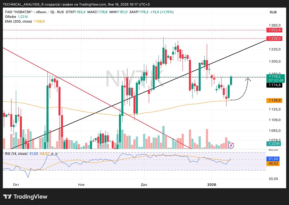 Технический анализ акций Новатэк: что говорит график о перспективах роста? Сейчас цена отскочила от EMA200, что логично — это сильная динамическая поддержка, от которой бумагу уже не раз подбирали. Но рост упёрся в ближайшее сопротивление в зоне 1175–1180, где ранее были развороты и фиксация. Рынок пытается восстановиться после коррекции, импульс есть, но он уже не свободный. Цена стоит прямо под сопротивлением, дальше нужен либо объём, либо откат. Без этого движение вверх будет тяжёлым. Поддержка — 1135–2140 (EMA200 + локальные минимумы). Сопротивление — 1175–1180, выше — 1220–1240. RSI около 50, перекупленности нет, но и запаса для резкого рывка немного. Структура пока больше похожа на отскок внутри диапазона, а не на начало тренда. НОВАТЭК остаётся сильной историей в газе, но бумага чувствительна к рынку в целом и к геополитическому фону. Сейчас драйверов, которые могли бы сразу пробить сопротивление, нет. Драйвер — пробой и закрепление выше 1180 с объёмом. Риск — отказ от пробоя и возврат к EMA200, вплоть до 1135. Для инвестора это не точка агрессивной покупки. Цена уже выросла от поддержки и пришла к сопротивлению. Оптимально либо ждать откат ближе к EMA200, либо дожидаться уверенного пробоя 1180. Подходит для аккуратного долгосрока по подтверждению, а не для погони за ценой. Не является индивидуальной инвестиционной рекомендацией Пост взят с соцсети [M O N D I A R A](https://i.mondiara.com/) 👉 вот ссылка на канал: https://i.mondiara.com/i/c/novatek_analytics Скачать в [App Store](https://apps.apple.com/ru/app/m-o-n-d-i-a-r-a/id6475953453) Скачать в [Google Play](https://play.google.com/store/apps/details?id=com.mondiara.app) Валюта расчёта - Ваши добрые мысли! Спасибо, что с нами! Источник: Инвестиции в будущее