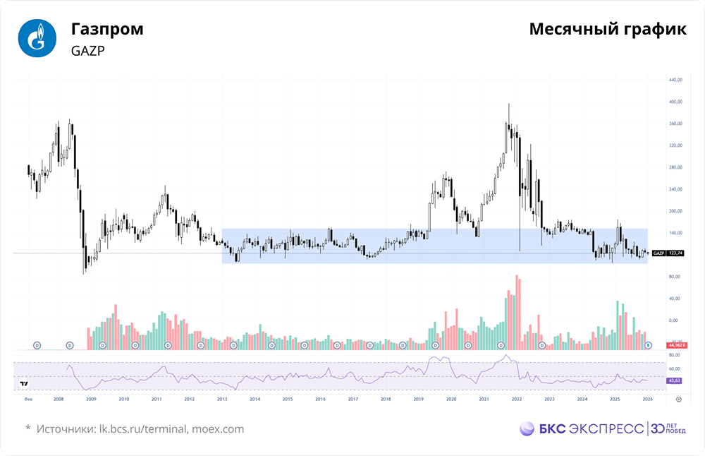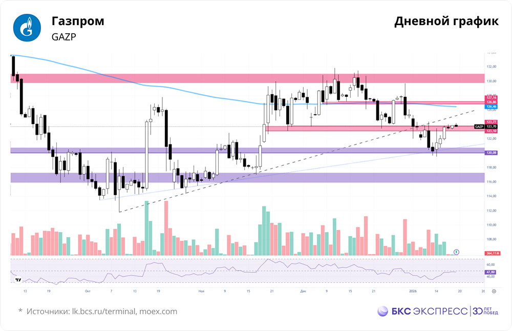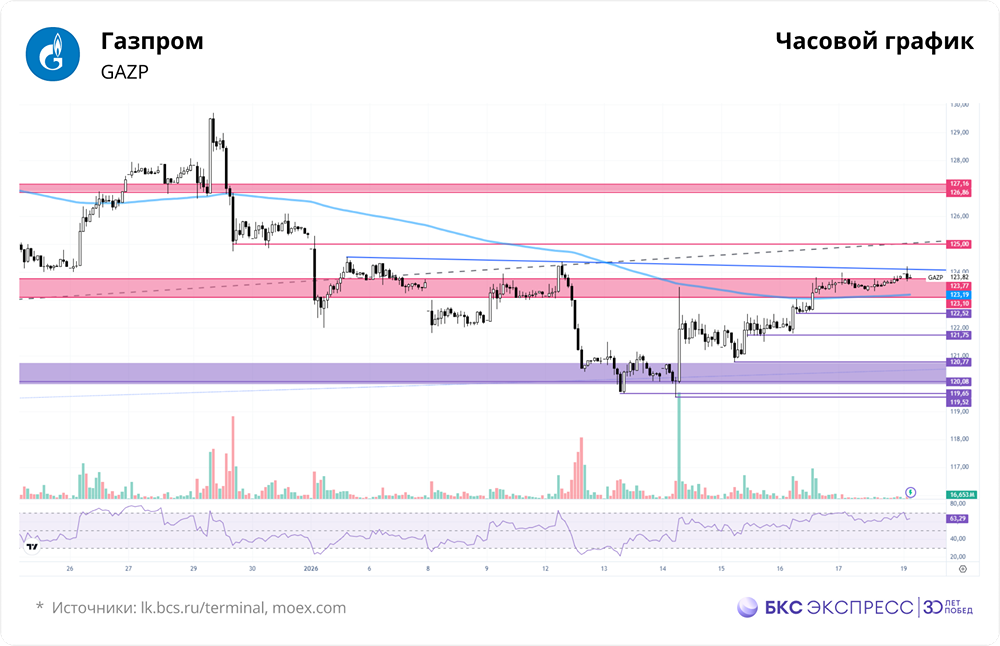 Мнение: БКС Экспресс Прогноз по акциям Газпрома Акции Газпрома в пятницу выросли на 1,34%, закрывшись на уровне 123,63 рублей (+1,34% за день). Общий объем торгов составил 5,1 млрд рублей, что на 27% больше, чем в предыдущий день. За выходные акции прибавили 0,18%, но сегодня утром снизились на 0,11%. Краткосрочная перспектива Акции Газпрома достигли сопротивления в диапазоне 123,1–123,77 рублей. Утренняя цена остается выше этого уровня, что позитивно. Однако важно следить за основной сессией, так как рост среды — пятницы может быть лишь временным отскоком в рамках текущей нисходящей тенденции. На прошлой неделе акции пробились через трехмесячный восходящий тренд, сформировав разворотную формацию. Цена может вернуться к этим уровням, тестируя их как сопротивления, прежде чем продолжить снижение. Также стоит отметить, что в последнее время наблюдается недостаток ликвидности, что может снижать точность технических сигналов. Объем торгов пятницы вырос по сравнению с четвергом, но все же остается низким. Ближайшие уровни сопротивления находятся на отметках 124 и 125 рублей. Далее следует блок в районе 126,8–127,2 рублей. Ближайшая поддержка — 123,1–123,77 рублей. Пробой этой зоны может сигнализировать о возобновлении нисходящего тренда или, в лучшем случае, о повторном тестировании района 120–122 рублей. Внешний фон Индекс S&P 500 завершил неделю нейтрально. В США сегодня выходной — День Мартина Лютера Кинга. Фьючерсы на нефть марки Brent торгуются около $64,29, что на 0,25% выше предыдущего закрытия. Уровни сопротивления: 124, 125, 126,86. Уровни поддержки: 123,7, 123,1, 122,5. Долгосрочная перспектива У акций Газпрома нет четкого долгосрочного тренда, последний из которых был утерян в прошлом году. Текущая динамика характеризуется как боковая. Котировки могут оставаться в этом состоянии длительное время. Блок консолидации находится в диапазоне 130–155 рублей, где акции торговались в 2013–2017 годах. С учетом выбросов, более широкий диапазон составляет 110–170 рублей. Согласно фундаментальному анализу, целевой уровень БКС по акциям Газпрома на данный момент — 130 рублей, с негативным прогнозом. Автор: Рокотянская Людмила Не является индивидуальной инвестиционной рекомендацией Пост взят с соцсети [M O N D I A R A](https://i.mondiara.com/) 👉 вот ссылка на канал: https://i.mondiara.com/i/c/gazprom_analytics Скачать в [App Store](https://apps.apple.com/ru/app/m-o-n-d-i-a-r-a/id6475953453) Скачать в [Google Play](https://play.google.com/store/apps/details?id=com.mondiara.app) Валюта расчёта - Ваши добрые мысли! Спасибо, что с нами! Источник: bcs-express.ru