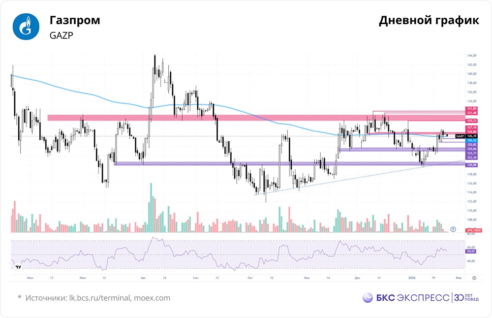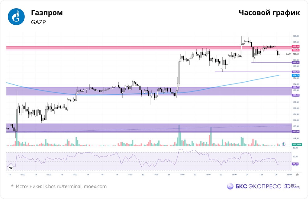 Мнение: БКС Экспресс Прогноз по акциям Газпрома Акции Газпрома в пятницу подорожали на 1,48% и закрылись на отметке 126,43 руб., а вечером — на 127,60 руб. Общий объем торгов составил 6,7 млрд руб., что на 15% меньше, чем в предыдущий день. За выходные цена снизилась на 0,31%, а сегодня утром упала еще на 0,8%. Краткосрочная картина Акции Газпрома выросли на прошлой неделе благодаря геополитическим событиям. Однако объемы торгов остаются низкими, что может быть связано с ожиданием рынка новых данных. Цена достигла уровня сопротивления 126,8–127,2 руб., где наблюдался локальный перегрев. Это остановило рост. Тем не менее, пятницу акции завершили в плюсе. Преодоление уровня 126,8–127,2 руб. может открыть путь к следующей цели — 130 руб. Если цена откатится от этого уровня, это усилит коррекцию. Ближайшая поддержка находится на уровне 125,8 руб., затем — 124,7–125 руб. Индекс относительной силы (RSI) на часовых графиках в нейтральной зоне. Внешний фон Индекс S&P 500 вырос на 0,03% в пятницу. Сегодня фьючерсы на индекс теряют 0,2%. Фьючерсы на нефть Brent торгуются около $65,10 (-1,18%). Уровни сопротивления: 126,8; 127,2; 130. Уровни поддержки: 125,8; 125; 124,7. Долгосрочная картина У акций Газпрома нет долгосрочных трендов. Последний тренд был потерян в прошлом году, и сейчас динамика остается боковой. Котировки могут находиться в этом состоянии долго. Существует блок консолидации с границами 130–155 руб., где акции торговались в 2013–2017 годах. С учетом выбросов диапазон расширяется до 110–170 руб. По фундаментальному анализу, целевая цена акций Газпрома от БКС — 130 руб., прогноз — «негативный». Автор: Рокотянская Оксана Не является индивидуальной инвестиционной рекомендацией Пост взят с международного сервиса для инвесторов и трейдеров [M O N D I A R A](https://i.mondiara.com/) 👉 вот ссылка на канал: https://i.mondiara.com/i/c/gazprom_analytics Скачать приложение в [App Store](https://apps.apple.com/ru/app/m-o-n-d-i-a-r-a/id6475953453) Скачать приложение в [Google Play](https://play.google.com/store/apps/details?id=com.mondiara.app) Валюта расчёта - Ваши добрые мысли! Спасибо, что с нами! [M O N D I A R A](https://i.mondiara.com/) — ключевой инструмент для исследований, торговли, инвестирования и стратегического планирования на российском фондовом рынке Источник: bcs-express.ru