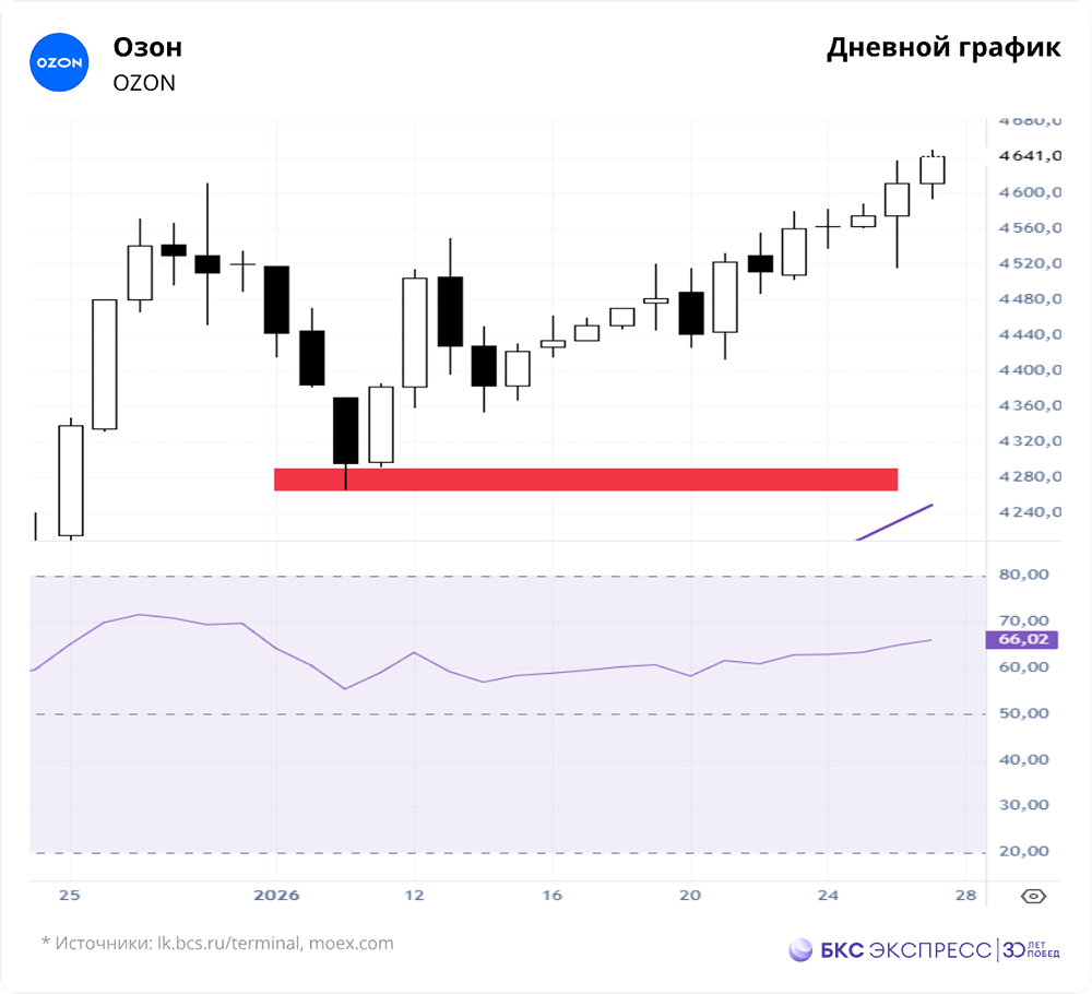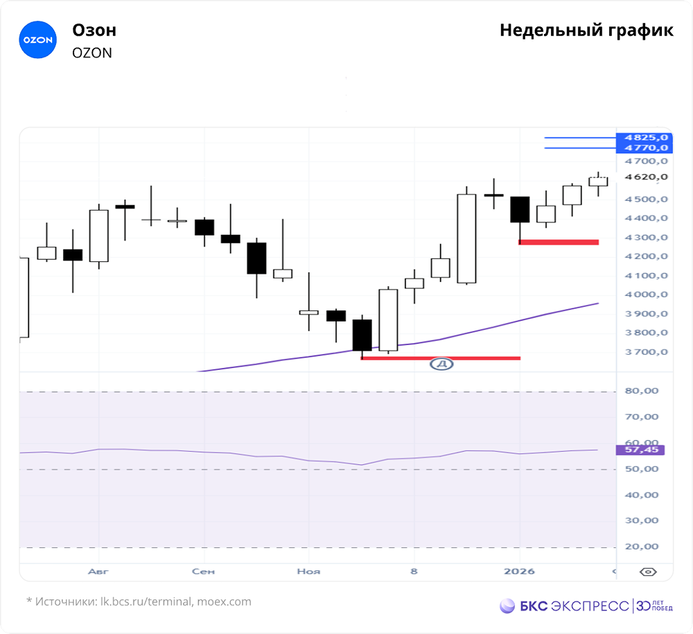 Мнение: БКС Экспресс Прогноз по акциям ОЗОН Акции компании «Озон» на предыдущей торговой сессии выросли на 0,81%, закрывшись на уровне 4611,5 рублей. Бумаги показали лучший результат по сравнению с рынком, а объем торгов достиг 2,08 млрд рублей. Краткосрочная перспектива • В понедельник акции преодолели важное сопротивление на уровне 4611 и достигли максимума в 4648, стремясь обновить исторический максимум в 4779,5. • Пока не пробит уровень 4265, продолжение роста к долгосрочным целям остается оптимальным. • На дневном графике RSI находится на уровне 66 пунктов, а на 4-часовом — выше 50- и 200-дневной скользящих средних. Основное внимание уделяется уровням сопротивления и поддержки: 4770 и 4265. Внешний фон • Индекс S&P 500 вырос на 0,51% в понедельник, начав день с прироста в 0,2%. Азиатские индексы торгуются в плюсе. Нефть Brent упала на 0,44%, начав день с падения на 0,4%. Уровни сопротивления и поддержки: Сопротивление: 4648 / 4770 / 4779,5 Поддержка: 4265 / 4053 / 3662,5 Долгосрочная перспектива • На недельном графике акции продолжают расти. Пока поддержка на уровне 4265 не пробита, дорога к целям роста 4770–4825 остается открытой. После этого важно следить за реакцией продавцов. • Локальные цели движения определяются в краткосрочной перспективе. В долгосрочной — ключевым является закрытие недельной свечи в конце торгов пятницы. «Озон» — вторая по величине площадка электронной коммерции в России после Wildberries. Компания отчиталась лучше ожиданий по итогам III квартала: • GMV вырос на 53% год к году до 1,1 трлн рублей (прогноз — 1 трлн). • Скорректированная EBITDA достигла 41,5 млрд рублей (прогноз — 30 млрд). • Прибыль составила 2,9 млрд рублей против убытка 0,7 млрд год к году (прогноз — -1,3 млрд). • Доля рынка e-commerce выросла до 26% (с 24% в 2022 году). • Запущен обратный выкуп акций на 25 млрд рублей до конца 2026 года — один из крупнейших байбэков на рынке. Это должно поддержать котировки. Автор: Мамонтов Андрей Не является индивидуальной инвестиционной рекомендацией Пост взят с международного сервиса для инвесторов и трейдеров [M O N D I A R A](https://i.mondiara.com/) 👉 вот ссылка на канал: https://i.mondiara.com/i/c/ozon_analytics Скачать приложение в [App Store](https://apps.apple.com/ru/app/m-o-n-d-i-a-r-a/id6475953453) Скачать приложение в [Google Play](https://play.google.com/store/apps/details?id=com.mondiara.app) Валюта расчёта - Ваши добрые мысли! Спасибо, что с нами! [M O N D I A R A](https://i.mondiara.com/) — ключевой инструмент для исследований, торговли, инвестирования и стратегического планирования на российском фондовом рынке Источник: bcs-express.ru