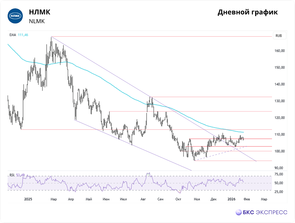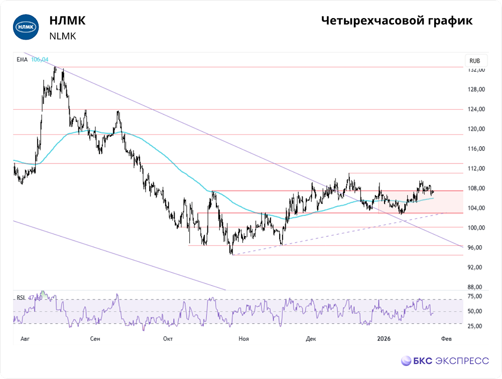 Мнение: БКС Экспресс Акции НЛМК опять в боковике Акции НЛМК 26 января упали на 1,18%, закрывшись на уровне 107,3 руб. Объём торгов составил 0,62 млрд руб. На утренней сессии котировки остаются у достигнутых уровней. Краткосрочная динамика • Акции НЛМК отскочили от верхней границы недавнего боковика 107,5 руб. и немного выросли в выходные. Однако в понедельник отсутствие геополитических новостей по Украине привело к откату и пробитию поддержки. • Утром акции в символическом плюсе. Ранее вырвавшись из боковика, бумаги рискуют снова в нём застрять. На уровне 107 руб. поддержку оказывает 200-часовая скользящая средняя. Отскок от неё может вернуть котировки выше 107,5 руб. и приблизить цель на трёхмесячные максимумы — 111,1 руб. Далее внимание будет уделено 200-дневной скользящей средней на 111,5 руб. Её преодоление откроет путь к минимумам 2024 г. — 113,2 руб. • При негативной динамике промежуточной поддержкой станет ещё одна EMA 200 на 4-часовом графике (106 руб.). Локальный восходящий тренд от минимумов 2025 г. сейчас выступает опорой на уровне 103 руб. Снижение ниже увеличит риски падения до 100 руб. — уровней начала октября. Внешний фон • Индекс S&P 500 вырос на 0,5% в понедельник, фьючерсы прибавляют 0,3%. Индексы АТР преимущественно в плюсе: японский Nikkei и гонконгский Hang Seng растут на 0,7% и 1,1% соответственно, а китайский Shanghai Composite консолидируется. Нефть Brent с утра опустилась на 0,7%, до $65,2 за баррель. Уровни сопротивления: 107,5 / 111,5 / 113,2 Уровни поддержки: 106 / 103 / 100 Долгосрочная перспектива • Остановка цикла ужесточения денежно-кредитной политики ЦБ и надежды на улучшение геополитической ситуации в 2024 г. поддержали рост акций НЛМК, подняв их до максимумов 2025 г. выше 168 руб. Впоследствии котировки откатились из-за общерыночных настроений и ухудшения ситуации на рынке стали. • С июля начался отскок, и акции вышли из нисходящего тренда. Попытки закрепиться выше 200-дневной скользящей средней завершились падением к новым годовым минимумам, от которых удалось отступить осенью. • В Стратегии на 2026 г. целевая цена по акциям НЛМК повышена на 8%, до 130 руб., а взгляд сохранён «Нейтральным». Ожидается, что снижение ключевой ставки поддержит строительный сектор во II полугодии 2026 г., что может немного восстановить спрос на сталь. Автор: Попова Анастасия Не является индивидуальной инвестиционной рекомендацией Пост взят с международного сервиса для инвесторов и трейдеров [M O N D I A R A](https://i.mondiara.com/) 👉 вот ссылка на канал: https://i.mondiara.com/i/c/nlmk_analytics Скачать приложение в [App Store](https://apps.apple.com/ru/app/m-o-n-d-i-a-r-a/id6475953453) Скачать приложение в [Google Play](https://play.google.com/store/apps/details?id=com.mondiara.app) Валюта расчёта - Ваши добрые мысли! Спасибо, что с нами! [M O N D I A R A](https://i.mondiara.com/) — ключевой инструмент для исследований, торговли, инвестирования и стратегического планирования на российском фондовом рынке Источник: bcs-express.ru