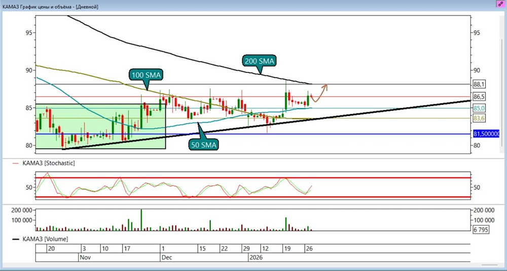 Цели по лонгу на уровне ₽87 были выполнены • Профит +1,72%. Стохастик только начинает разворачиваться от нижней границы своего диапазона. Продаж сильных я так и не увидел. Снизу трендовая поддержка формирует боковик. • Вторая цель по лонгу на скользящей 200 SMA или ₽88,1 на сегодня. • Стоп ₽81,5 (тот же) Не является индивидуальной инвестиционной рекомендацией Пост взят с международного сервиса для инвесторов и трейдеров [M O N D I A R A](https://i.mondiara.com/) 👉 вот ссылка на канал: https://i.mondiara.com/i/c/kamaz_analytics Скачать приложение в [App Store](https://apps.apple.com/ru/app/m-o-n-d-i-a-r-a/id6475953453) Скачать приложение в [Google Play](https://play.google.com/store/apps/details?id=com.mondiara.app) Валюта расчёта - Ваши добрые мысли! Спасибо, что с нами! [M O N D I A R A](https://i.mondiara.com/) — ключевой инструмент для исследований, торговли, инвестирования и стратегического планирования на российском фондовом рынке