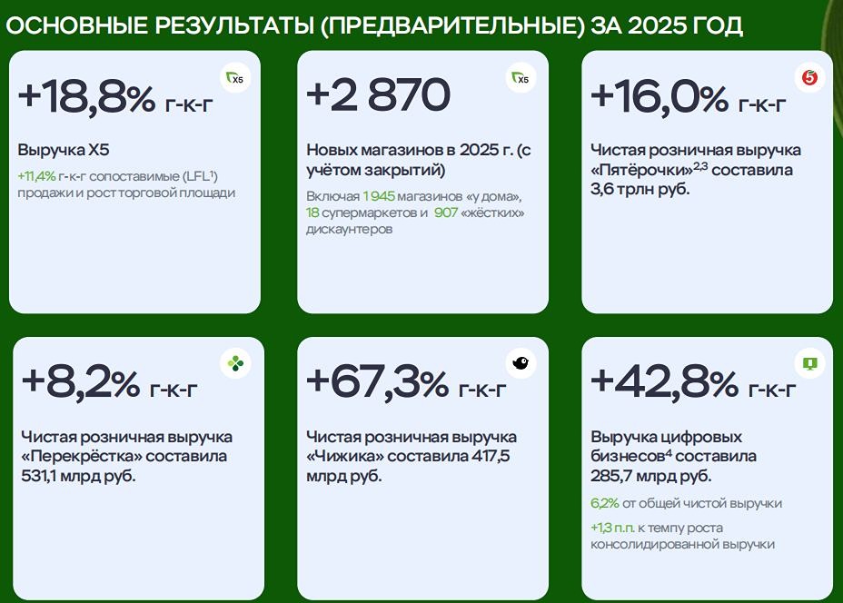 ИКС 5 и итоги 2025: рост продолжается, но рынок остывает X5 Group представила предварительные операционные показатели и данные по выручке за 2025 год. Этот отчет можно назвать «рентгеном» продуктового ритейла в текущих условиях. Он отражает не только успехи X5, но и тенденции всего рынка. Ключевые цифры 2025 года: - Чистая розничная выручка выросла на 18,8% и составила 4,64 трлн рублей. - LFL-продажи увеличились на 11,4%: средний чек поднялся на 9,6%, а трафик — на 1,6%. - Открыто 2870 новых магазинов. - Выручка цифровых бизнесов выросла на 42,8% и достигла 285,7 млрд рублей. Важно отметить, что рост в основном обеспечен увеличением среднего чека, а не трафика. Это характерно для всего продуктового ритейла в 2025 году. Покупатели стали осторожнее, но готовы платить больше из-за инфляции, изменения потребительской корзины и роста доли дисконт-магазинов. Форматы: кто лидирует: - «Пятёрочка» — основной драйвер бизнеса: выручка выросла на 16%, её доля в структуре группы составляет 78%. - «Перекрёсток» растет сдержанно (+8,2%), этот формат скорее стабилизирует, чем стимулирует развитие. - «Чижик» — главный герой отчета: выручка увеличилась на 67%, достигнута положительная EBITDA в IV квартале, за год открыто почти тысяча новых жёстких дискаунтеров. «Чижик» демонстрирует главный тренд: потребители предпочитают экономить, а не увеличивать расходы. Логистика и экосистема: В 2025 году X5 запустила 11 распределительных центров, расширила автопарк и улучшила доставку. Сервис 5Post заработал 7,9 млрд рублей, а цифровые сервисы принесли более 6% от общей выручки. Это не просто инфраструктура, а основа для дальнейшего роста в условиях снижения маржи. Что говорит рынок: Во втором полугодии заметно замедление роста: - Инфляция на продукты снизилась. - Физический рост рынка почти остановился. - Конкуренция усиливается. Наше мнение: X5 Group завершила 2025 год стабильно — без резких скачков, но и без серьёзных провалов. Компания подтвердила статус лидера благодаря масштабам, разнообразию форматов, эффективной логистике и дисциплине в операционных показателях. Хотя отчет не выглядит впечатляющим, именно такие цифры ценят долгосрочные инвесторы. Для рынка в целом результаты X5 — сигнал: продуктовый ритейл переходит в фазу умеренного роста, где акцент делается на эффективность, а не на агрессивную экспансию. Не является индивидуальной инвестиционной рекомендацией Пост взят с международного сервиса для инвесторов и трейдеров [M O N D I A R A](https://i.mondiara.com/) 👉 вот ссылка на канал: https://i.mondiara.com/i/c/x5_analytics Скачать приложение в [App Store](https://apps.apple.com/ru/app/m-o-n-d-i-a-r-a/id6475953453) Скачать приложение в [Google Play](https://play.google.com/store/apps/details?id=com.mondiara.app) Валюта расчёта - Ваши добрые мысли! Спасибо, что с нами! [M O N D I A R A](https://i.mondiara.com/) — ключевой инструмент для исследований, торговли, инвестирования и стратегического планирования на российском фондовом рынке Источник: Коношевская Ольга | Инвестиции