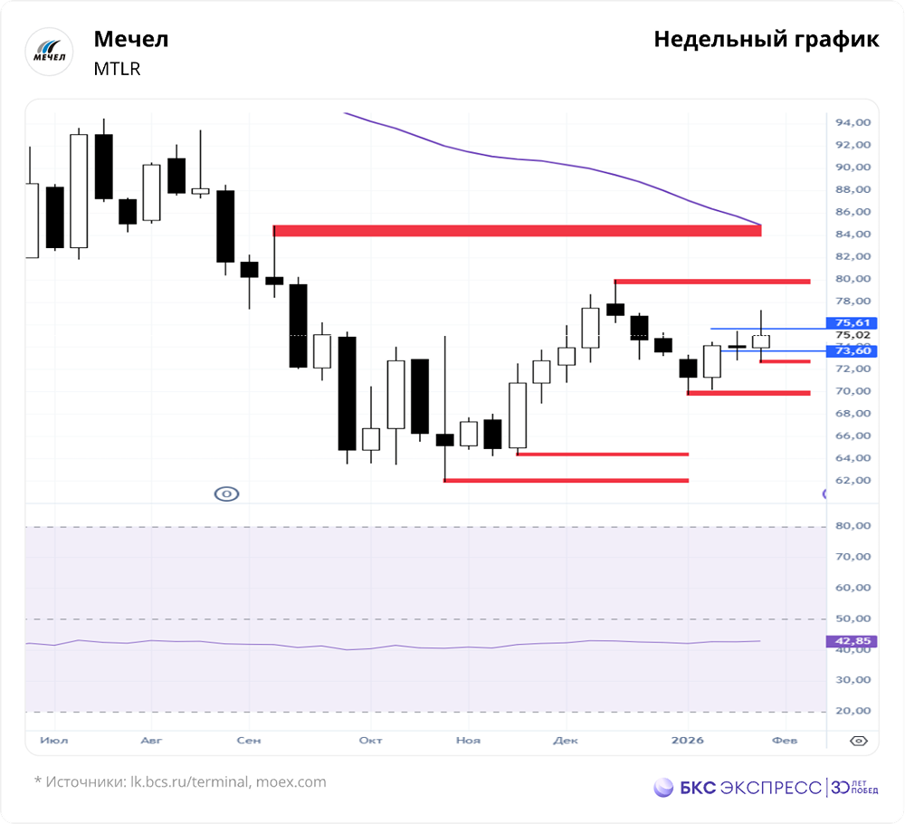 Мнение: БКС Экспресс Прогноз стоимости акций Мечела: Вероятность коррекции увеличивается Акции компании «Мечел» на прошлой торговой сессии поднялись на 1,76%, закрывшись на уровне 75,86 рубля. Бумаги показали более сильную динамику, чем рынок в целом, при этом объем торгов достиг 1 млрд рублей. Краткосрочная перспектива • Бумаги преодолели диапазон 72,75–75,44, и неделя завершилась ростом. Максимум был зафиксирован на уровне 77,27 рубля. • Сейчас структура рынка указывает на возможную коррекцию. Первая цель — слом уровня поддержки 72,59 рубля на следующей неделе. Движение может продолжиться в зону 70,44–69,93 рубля. Этот сценарий остается актуальным, пока уровень сопротивления 77,27 не будет пробит. • Особое внимание следует уделить уровням сопротивления и поддержки: 77,27 и 72,59 рубля. Внешний фон Индекс S&P 500 в четверг снизился на 0,21%, а утром потерял еще 0,6%. Азиатские индексы преимущественно находятся в минусе. Нефть Brent в четверг выросла на 3,38%, но утром торговалась с понижением на 1,4%. Уровни сопротивления: 77,27 / 80 / 84,84 Уровни поддержки: 72,59 / 69,71 / 64,2 Долгосрочная перспектива • Волна роста достигла основных целей 73,6–75,61 рубля. Теперь ждем формирования новой структуры на недельном графике, чтобы оценить дальнейшие цели. • Локальные цели рассматриваем в краткосрочной перспективе. В долгосрочной — следим за закрытием недельной свечи в конце пятницы. • Сохраняем «негативный» взгляд на акции компании из-за низких цен на уголь, высокой ключевой ставки и кризиса в сталелитейной и угольной отраслях России и Китая. • Высокие ставки, низкие цены на уголь и сталь вынуждают холдинг увеличивать долг. Ключевая ставка ЦБ РФ остается двузначной. У компании около 90% кредитов в рублях с плавающей ставкой. По нашим оценкам, текущая ситуация не позволяет «Мечелу» генерировать достаточно EBITDA для покрытия процентов, что приведет к росту долга к 2025 году. Автор: Мамонтов Андрей Не является индивидуальной инвестиционной рекомендацией Пост взят с соцсети [M O N D I A R A](https://i.mondiara.com/) 👉 вот ссылка на канал: https://i.mondiara.com/i/c/mechel_analytics Скачать в [App Store](https://apps.apple.com/ru/app/m-o-n-d-i-a-r-a/id6475953453) Скачать в [Google Play](https://play.google.com/store/apps/details?id=com.mondiara.app) Валюта расчёта - Ваши добрые мысли! Спасибо, что с нами! Источник: bcs-express.ru