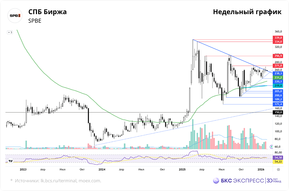 Мнение: БКС Экспресс Прогноз по акциям СПБ Биржи Акции СПБ Биржи в пятницу снизились на 2,28%, до 257,3 руб. В выходные они выросли на 1,08%, до 260,1 руб. Объем торгов был средним — около 1,5 млрд руб. Сегодня, утром, бумаги потеряли 0,7% по сравнению с закрытием воскресенья. Краткосрочная картина • Акции тестируют верхнюю границу сужающегося диапазона. Акции Индекса МосБиржи в пятницу преимущественно снижались. Сам индекс потерял 0,54% за основную сессию и упал на 1,49% на вечерних торгах по сравнению с закрытием четверга. • За последние две недели акции СПБ Биржи двигались вблизи нисходящего тренда, начавшегося в феврале 2025 года. После скачка 21 января 2026 года бумаги закрылись выше динамической границы, но затем начали снижаться. Периодические попытки роста сменялись равным снижением на следующий день. • Движение вблизи динамического уровня может быть связано с геополитическими факторами. Акции сильно зависят от внешней политики, и отсутствие явных триггеров для направленного движения приводит к коррекции. Спекулянты снижают риски после наращивания позиций на позитивных новостях. • Сверху акции ограничены нисходящим трендом, а поддержку оказывает EMA 200. Основной сценарий — продолжение бокового движения в указанном диапазоне. Стабильность ключевого фактора усиливает роль технических уровней. • Дипломатические переговоры активны, но вмешиваются новые факторы. Трехсторонние переговоры США, России и Украины были запланированы на 1 февраля, но из-за напряжения между Ираном и США их перенесли на середину недели. • Без улучшения рыночных настроений вероятен возврат к нижней границе боковика. Длительная неопределенность может привести к пробою 200-дневной скользящей средней и коррекции к 205 руб. • Внезапное улучшение внешнего фона может быстро поднять акции. Этот сценарий возможен из-за особенностей дипломатического взаимодействия. Первой целью роста станет максимум августа 2025 г. — около 297 руб. Внешний фон • В пятницу S&P 500 упал на 0,41%. Сегодня фьючерс на этот индекс в минусе на 0,7%. Азиатские индексы торгуются в основном в минусе. Цены на нефть Brent снижаются на 4,5%, до $66,2 за баррель. Уровни сопротивления: 260 / 272 / 297 Уровни поддержки: 240 / 220 / 205 Долгосрочная картина • Акции торгуются ниже цены IPO — $11,5, что эквивалентно 834,9 руб. по курсу ЦБ РФ на 19 октября 2021 г. С момента размещения котировки потеряли около 65%. • В феврале 2025 г. акции импульсно выросли, пробив восходящий канал, сформировавшийся более года. Рост был вызван спекулятивным спросом на фоне потенциальной геополитической стабильности. Эффект был кратковременным, и к концу июля котировки вернулись ниже 200 руб. • В августе 2025 г. появились признаки улучшения отношений России на международной арене, что позволило котировкам подняться до 300 руб. Но охлаждение дипломатических отношений привело к возврату ниже 200 руб. • Период октября 2025 г. был коротким и менее волатильным, но акции удержались выше 200-дневной скользящей. • В декабре 2025 г. акции закрылись нейтрально после бычьего месяца. Январь также был нейтральным, но с тревожными сигналами о попытках пробоя поддержки. Уровень 271,8 устойчив с конца III квартала 2025 г. Автор: Смирнов Андрей Не является индивидуальной инвестиционной рекомендацией Пост взят с соцсети [M O N D I A R A](https://i.mondiara.com/) 👉 вот ссылка на канал: https://i.mondiara.com/i/c/sbp_birzha_analytics Скачать в [App S