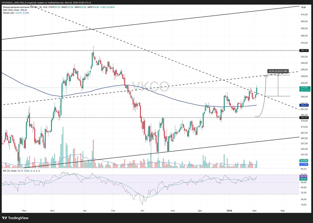 Пробой нисходящей трендовой состоялся, цена закрепилась выше и продолжает двигаться по плану. Это важный технический сигнал, который подтверждает смену фазы рынка с коррекционной на растущую. Ближайшая цель находится в зоне 329-330. Потенциал движения от текущих ещё около +4-5%. Именно здесь проходит следующая зона сопротивления, где логично ждать паузу или частичную фиксацию. EMA200 теперь выступает поддержкой в районе 295-300. Пока цена выше этой зоны, структура остается бычьей, и откаты выглядят рабочими, а не опасными. RSI в районе 60-66, перекупленности пока нет, рост не выглядит перегретым. Объемы постепенно подтягиваются, что поддерживает сценарий продолжения движения. Вывод простой. План отрабатывается корректно. Пока цена выше пробитого тренда и EMA200, приоритет за ростом. Цель 329-330 остается актуальной, дальше нужно будет смотреть на реакцию рынка в этой зоне. Не является индивидуальной инвестиционной рекомендацией Пост взят с международного сервиса для инвесторов и трейдеров [M O N D I A R A](https://i.mondiara.com/) 👉 вот ссылка на канал: https://i.mondiara.com/i/c/vk_analytics Скачать приложение в [App Store](https://apps.apple.com/ru/app/m-o-n-d-i-a-r-a/id6475953453) Скачать приложение в [Google Play](https://play.google.com/store/apps/details?id=com.mondiara.app) Валюта расчёта - Ваши добрые мысли! Спасибо, что с нами! [M O N D I A R A](https://i.mondiara.com/) — ключевой инструмент для исследований, торговли, инвестирования и стратегического планирования на российском фондовом рынке Источник: Капибара на Бирже