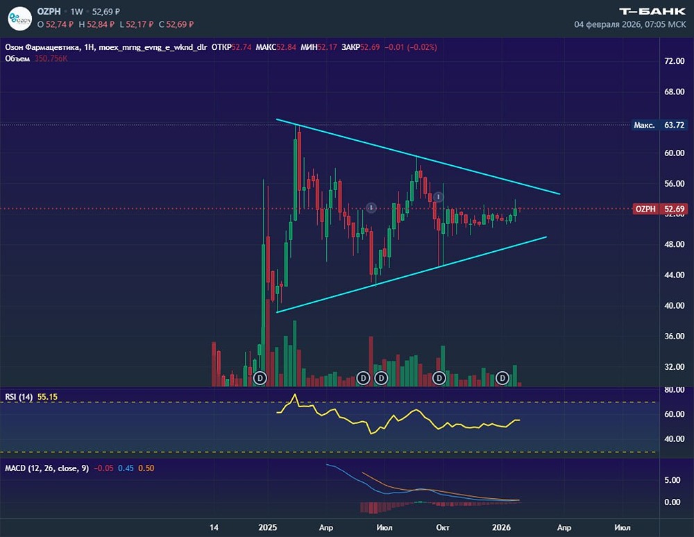 Акции «Озон Фармацевтики» формируют большой долгосрочный треугольник. Целью этой формации будет уровень 80. Но нужно учитывать, что и формироваться треугольник может ещё долго, и его отработка займёт тоже немало времени. Не является индивидуальной инвестиционной рекомендацией Пост взят с международного сервиса для инвесторов и трейдеров [M O N D I A R A](https://i.mondiara.com/) 👉 вот ссылка на канал: https://i.mondiara.com/i/c/ozon_farma_analytics Скачать приложение в [App Store](https://apps.apple.com/ru/app/m-o-n-d-i-a-r-a/id6475953453) Скачать приложение в [Google Play](https://play.google.com/store/apps/details?id=com.mondiara.app) Валюта расчёта - Ваши добрые мысли! Спасибо, что с нами! [M O N D I A R A](https://i.mondiara.com/) — ключевой инструмент для исследований, торговли, инвестирования и стратегического планирования на российском фондовом рынке Источник: Мысли Финансиста