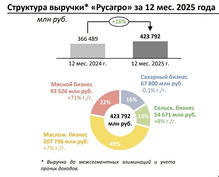 По итогам 2025 «Русагро» обновило рекорд, нарастив консолидированную выручку на 16%, до 424 млрд руб. Рост обеспечен успешной интеграцией «Агро-Белогорье» и развитием ключевых направлений. ▫️ Мясной бизнес стал главным драйвером: выручка выросла на 71%, производство свинины — на 64%. Результат достигнут благодаря синергии с новым активом и повышению эффективности в ЦФО и Приморье. ▫️ Сельскохозяйственный бизнес увеличил выручку на 8%, достигнув рекордного экспорта. Продажи зерновых выросли на 47% за счет высокой урожайности и развития трейдингового канала. ▫️ Масложировой бизнес, несмотря на 9-месячную остановку Аткарского МЭЗ на модернизацию, нарастил выручку на 7%. Снижение производства компенсировано развитием логистики и экспорта. Запуск обновленного завода в 2026 году увеличит мощности на 56%. ▫️ Сахарный бизнес сохранил устойчивость в условиях конкуренции, удержав выручку на уровне 68 млрд руб. Продажи сахара выросли на 3% благодаря экспортным контрактам. Пока акции под давлением из-за неопределенности с дальнейшей судьбой доли мажоритарного акционера, но в целом, считаю, можно держать с первой целью в районе 150 руб. Не является индивидуальной инвестиционной рекомендацией Пост взят с международного сервиса для инвесторов и трейдеров [M O N D I A R A](https://i.mondiara.com/) 👉 вот ссылка на канал: https://i.mondiara.com/i/c/rusagro_analytics Скачать приложение в [App Store](https://apps.apple.com/ru/app/m-o-n-d-i-a-r-a/id6475953453) Скачать приложение в [Google Play](https://play.google.com/store/apps/details?id=com.mondiara.app) Валюта расчёта - Ваши добрые мысли! Спасибо, что с нами! [M O N D I A R A](https://i.mondiara.com/) — ключевой инструмент для исследований, торговли, инвестирования и стратегического планирования на российском фондовом рынке Источник: Залим Сохов - ON FLEEK investing