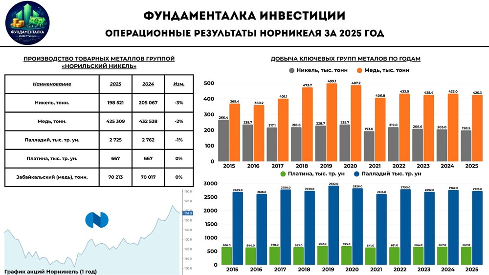 В этом обзоре рассмотрим операционные результаты ГМК Норникель за 2025 год. Норникель — крупнейший мировой производитель палладия, один из ведущих производителей никеля, платины и меди. Акции компании выросли на 36,4% за последний год, а с учетом коррекции — на 45,5%. Основной причиной стало ралли цен на металлы, которые производит Норникель. С учетом коррекции динамика следующая: — Палладий: +80% — Медь: +39% — Никель: +15% — Платина: +6% Рост металлов начался на фоне ралли золота и серебра, что повлияло на результаты Норникеля. Перейдем к операционным итогам 2025 года: - Никель: план — 204 тыс. тонн, факт — 198,5 тыс. тонн. - Медь: план — 353 тыс. тонн, факт — 425,3 тыс. тонн. - Палладий: план — 2704 тыс. тр. ун., факт — 2725 тыс. тр. ун. - Платина: план — 662 тыс. тр. ун., факт — 667 тыс. тр. ун. - Забайкальский дивизион (медь в концентрате): план — 66 тыс. тонн, факт — 70,2 тыс. тонн. Норникель перевыполнил план по всем металлам, кроме никеля. Относительно прошлого года результаты менее впечатляющие: снижение никеля и меди на 3 и 2%, палладия — на 1%. По платине и Забайкальскому дивизиону план выполнен, но роста нет. Производственный прогноз на 2026 год скромнее и не предполагает роста. Однако динамика за 4 квартал 2025 года улучшилась благодаря завершению плановых ремонтов. - Никель: +9% кв/кв. - Медь: +12% кв/кв. - Палладий: +15% кв/кв. - Платина: +23% кв/кв. - Забайкальский дивизион (медь): +12% кв/кв. Дивиденды Президент Норникеля Владимир Потанин заявил, что дивидендов по итогам 2025 года, скорее всего, не будет. Приоритет компании — финансовая устойчивость и обслуживание долга. Однако на 2026 год запланирован положительный денежный поток для возврата к выплатам. За первое полугодие 2025 года FCF составил около $1,4 млрд, а по итогам года он будет больше благодаря благоприятной конъюнктуре цен на металлы. Чистый долг в рублях — 775 млрд, при ND/EBITDA = 1,6х. Дивиденды за 2026 год вероятны, но их сумма будет зависеть от цен на металлы, курса доллара и будущих финансовых результатов. Выводы Компания преодолела сложный период и ищет драйверы для переоценки. Долгосрочный таргет — 150 рублей за акцию. Акции Норникеля получили импульс роста благодаря ралли цен на металлы. Инвесторы, купившие акции после обзора, получили доход от 14% до 30%. Сейчас ситуация лучше, чем год назад, и благоприятная рыночная конъюнктура повышает вероятность дивидендов за 2026 год. Однако есть много неопределенностей. Для оценки перспектив компании нужно дождаться финансового отчета за 2025 год. Не является индивидуальной инвестиционной рекомендацией Пост взят с международного сервиса для инвесторов и трейдеров [M O N D I A R A](https://i.mondiara.com/) 👉 вот ссылка на канал: https://i.mondiara.com/i/c/nornikel_analytics Скачать приложение в [App Store](https://apps.apple.com/ru/app/m-o-n-d-i-a-r-a/id6475953453) Скачать приложение в [Google Play](https://play.google.com/store/apps/details?id=com.mondiara.app) Валюта расчёта - Ваши добрые мысли! Спасибо, что с нами! [M O N D I A R A](https://i.mondiara.com/) — ключевой инструмент для исследований, торговли, инвестирования и стратегического планирования на российском фондовом рынке Источник: Фундаменталка
