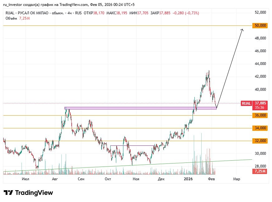 Предполагаю такое движение: окончание коррекции на поддержке и дальше вверх. Но есть и плохой вариант: 💼 Добор на долгосрок на уровне 37,3–37. 🏹 Цель — 50. ❌ При негативе можем утонуть до 36, 34, 32. Чем ниже, тем менее вероятно. Не является индивидуальной инвестиционной рекомендацией Пост взят с международного сервиса для инвесторов и трейдеров [M O N D I A R A](https://i.mondiara.com/) 👉 вот ссылка на канал: https://i.mondiara.com/i/c/rusal_analytics Скачать приложение в [App Store](https://apps.apple.com/ru/app/m-o-n-d-i-a-r-a/id6475953453) Скачать приложение в [Google Play](https://play.google.com/store/apps/details?id=com.mondiara.app) Валюта расчёта - Ваши добрые мысли! Спасибо, что с нами! [M O N D I A R A](https://i.mondiara.com/) — ключевой инструмент для исследований, торговли, инвестирования и стратегического планирования на российском фондовом рынке Источник: Хроники Инвестора