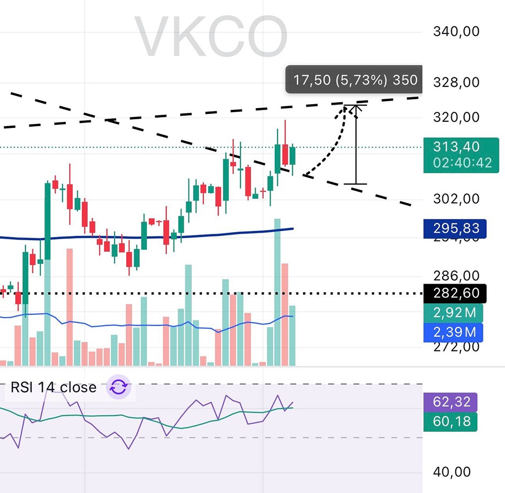 Цена вышла из нисходящего тренда, удержалась выше него и продолжает формировать более высокие минимумы. Откаты выкупаются, структура остается восходящей. EMA200 в районе 295 теперь выступает опорой, цена уверенно выше. Текущая логика движения — работа внутри восходящего канала. Середина канала проходит в зоне 323-335. Потенциал роста от текущих около +3-7%, сценарий выглядит базовым, пока цена остается выше 305-310. RSI в районе 60-62, перегрева нет, рост не выглядит последним импульсом. Объемы поддерживают движение, резкого выхода из позиции со стороны рынка не видно. Вывод простой. После пробоя тренда цена продолжает движение вверх. Пока выше 305, приоритет за ростом, цель по движению 323-335, где уже логично ждать паузу или фиксацию. Не является индивидуальной инвестиционной рекомендацией Пост взят с международного сервиса для инвесторов и трейдеров [M O N D I A R A](https://i.mondiara.com/) 👉 вот ссылка на канал: https://i.mondiara.com/i/c/vk_analytics Скачать приложение в [App Store](https://apps.apple.com/ru/app/m-o-n-d-i-a-r-a/id6475953453) Скачать приложение в [Google Play](https://play.google.com/store/apps/details?id=com.mondiara.app) Валюта расчёта - Ваши добрые мысли! Спасибо, что с нами! [M O N D I A R A](https://i.mondiara.com/) — ключевой инструмент для исследований, торговли, инвестирования и стратегического планирования на российском фондовом рынке Источник: Капибара на Бирже