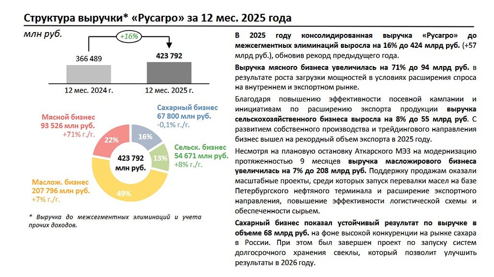 Русагро отчиталось о результатах за 2025 год: выручка растёт, но есть тревожные сигналы Рассмотрим операционный отчёт Русагро за 4 квартал и весь 2025 год. Основные показатели: - Выручка за 2025 год: 424 млрд рублей (+16% год к году) - Выручка за 4 квартал: 157 млрд рублей (+11% год к году) - Производство свинины: 571 тыс. тонн (+64% год к году) - Продажи свинины: 468 тыс. тонн (+65% год к году) - Продажи зерновых: 1,5 млн тонн (+47% год к году) - Продажи сахара: 1,1 млн тонн (+3% год к году) - Продажи масложировой продукции: 460 тыс. тонн (-9% год к году) На первый взгляд, результаты впечатляют: выручка установила новый рекорд, а мясной и зерновой сегменты показали двузначный рост. Однако ключевым фактором этого роста стала консолидация «Агро-Белогорье», выкупленного в конце 2024 года. Арест основателя компании Вадима Мошковича, вероятно, ограничит дальнейшие крупные приобретения, что может замедлить рост выручки до минимальных значений. Особенно учитывая снижение цен на свинину. Рост производства и продаж свинины на 64% и 65% соответственно впечатляет, но это в основном результат интеграции нового актива. Без него органический рост был бы скромнее. Контроль над «Агро-Белогорье» передан государству в доверительное управление, что ставит под вопрос его дальнейшее участие в Русагро. Экспортный сегмент показал значительный рост: продажи зерновых увеличились на 47%, а в 4 квартале — в 2,3 раза. Это связано с наращиванием экспорта и успешной работой трейдингового направления. Однако такой результат зависит от мировой конъюнктуры и логистики. Экспорт зерновых может резко вырасти или упасть в любой момент. Масложировой сегмент, ранее выступавший ключевым драйвером роста, показал негативную динамику: производство масла снизилось на 16%, а продажи потребительской продукции — на 9%. Причины — длительная модернизация Аткарского МЭЗ (завершена в январе 2026 года) и укрепление рубля, что негативно сказалось на экспорте. Сахарный сегмент также демонстрирует ухудшение: производство сахара упало на 15%, а продажи выросли лишь на 3%, в основном за счёт экспорта. Финансовые результаты не раскрываются, поэтому данных о прибыли, долге и EBITDA нет. Учитывая негативную тенденцию по прибыли и рост долговой нагрузки, ожидать значительного улучшения маржинальности в 2025 году не стоит, особенно учитывая высокие затраты на модернизацию. Главный фактор, влияющий на инвестиционный кейс Русагро, — уголовное дело против Мошковича. От его исхода и размера ущерба будет зависеть будущее компании. Основатель Русагро и бывший гендиректор остаются под стражей, а обвинения ужесточились (добавлены преднамеренное банкротство и отмывание денег). Завершено расследование, дело скоро пойдёт в суд. Обсуждаются возможные продажи активов для покрытия претензий. Если ключевые активы будут изъяты или проданы, инвестиционная привлекательность Русагро останется низкой, а акции — под давлением. Долгосрочные перспективы инвестирования в Русагро остаются туманными, а с учётом ужесточения обвинений против Мошковича они стали ещё менее ясными. До разрешения дела компания будет спекулятивной историей. Таргет по акциям Русагро, исходя из текущей отчётности, остаётся на уровне около 140 рублей за акцию. Однако после публикации финансовой отчётности и уточнения чистого долга он может быть скорректирован вниз. Не является индивидуа