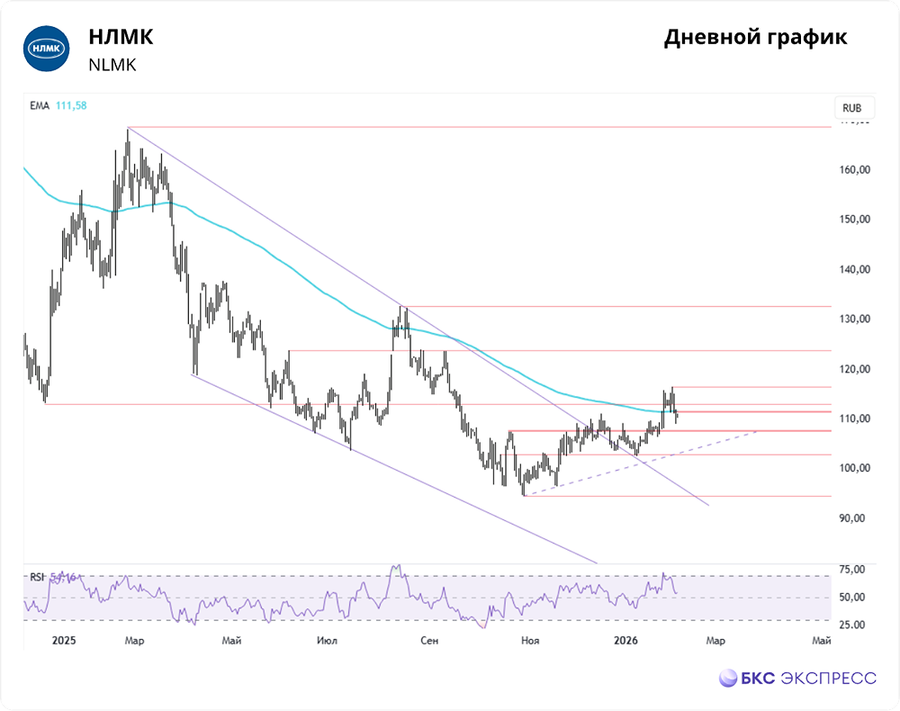 Мнение: БКС Экспресс Прогноз по акциям НЛМК Акции НЛМК в четверг, 5 февраля, снизились на 1,09% и закрылись на уровне 110,74 руб. Объем торгов составил 1 млрд руб. На утренней сессии пятницы котировки немного выросли на 0,1% и остались около 110,9 руб. Краткосрочная картина • В среду акции НЛМК продолжили падать после четырехмесячного роста. Котировки вышли за пределы узкого диапазона консолидации и опустились ниже минимумов 2024 года. В четверг ухудшение настроений на рынке привело к пробитию важной поддержки — 200-дневной скользящей средней. • Утром акции немного выросли. Если они закрепятся ниже уровня 111,6 руб. (200-дневная скользящая средняя на дневном таймфрейме), техническая картина может ухудшиться. В центре внимания окажется боковик конца декабря — начала января с границами 107,5–103 руб. По пути к нему есть промежуточное препятствие — 200-дневная скользящая средняя на 4-часовом графике (108,4 руб.). • Если акции отскочат и вернутся выше 111,6 руб., следующей целью станет подъем выше минимумов 2024 года (113,2 руб.). Затем курс может устремиться к максимумам июля (119,2 руб.), с промежуточной преградой на пиковых значениях года (116,4 руб.). Внешний фон • Индекс S&P 500 в четверг упал на 1,23%, а фьючерсы на него утром теряют 0,4%. Индексы АТР показывают смешанную динамику: японский Nikkei и китайский Shanghai Composite растут на 0,3%, а гонконгский Hang Seng снижается на 1,4%. Нефть Brent утром подорожала на 0,5% до $67,9 за баррель. Уровни сопротивления: 111,6, 113,2, 116,4 Уровни поддержки: 108,4, 107,5, 103 Долгосрочная картина • Остановка цикла ужесточения денежно-кредитной политики ЦБ и надежды на улучшение геополитической ситуации в конце 2024 года дали акциям НЛМК импульс роста. В 2025 году они поднимались выше 168 руб. Однако впоследствии, под влиянием общерыночных настроений и неблагоприятной конъюнктуры на рынке стали, котировки откатились. • Откат начался в июле, и акции вышли из нисходящего тренда, начавшегося с пиковых значений 2024 года. Попытки закрепиться выше 200-дневной скользящей средней завершились падением, которое привело к новым годовым минимумам. Осенью удалось отступить от них. В начале 2026 года предпринимаются попытки вернуть 200-дневную скользящую среднюю в качестве поддержки. Если это удастся, среднесрочная цель покупателей сместится к пиковым значениям лета 2025 года (132,7 руб.). • В стратегии на 2026 год мы повысили целевую цену акций НЛМК на 8% до 130 руб. и сохранили «Нейтральный» взгляд. Мы ожидаем, что медленное снижение ключевой ставки поддержит строительный сектор во втором полугодии 2026 года, что может привести к небольшому восстановлению спроса на рынке стали. Автор: Попова Анастасия Не является индивидуальной инвестиционной рекомендацией Пост взят с соцсети [M O N D I A R A](https://i.mondiara.com/) 👉 вот ссылка на канал: https://i.mondiara.com/i/c/nlmk_analytics Скачать в [App Store](https://apps.apple.com/ru/app/m-o-n-d-i-a-r-a/id6475953453) Скачать в [Google Play](https://play.google.com/store/apps/details?id=com.mondiara.app) Валюта расчёта - Ваши добрые мысли! Спасибо, что с нами! Источник: bcs-express.ru