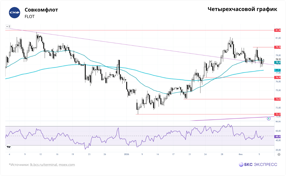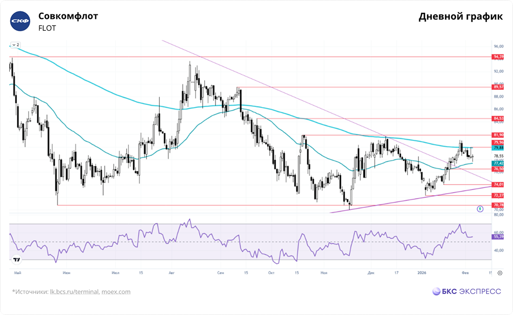 Мнение: БКС Экспресс Прогноз по акциям Совкомфлота В четверг акции Совкомфлота подорожали на 0,1%, закрывшись на уровне 78,55 руб. Объем торгов был средним — 0,2 млрд руб. Сегодня котировки снизились на 0,2%. Краткосрочная перспектива • Вчера акции Совкомфлота немного выросли при умеренной торговой активности. Российские акции в целом снизились. Индекс МосБиржи упал на 1,41% за основную сессию и еще на 1,16% по итогам вечерней сессии по сравнению с вечером среды. • Весь день акции Совкомфлота двигались без явного направления, оставаясь в диапазоне 77,6–78,9 руб. • День завершился свечой с небольшим телом и удлиненной тенью. Сигнал нейтральный: падение замедляется, но четкого разворота пока нет. • Из-за общей слабости рынка возможно снижение до уровня 76,5 руб., который может выступить локальной поддержкой. • Возможен также откат к наклонной поддержке, образованной верхним ребром сходящегося треугольника, откуда акции вышли 23 января. • Переговоры по украинскому конфликту продолжаются. Акции Совкомфлота могут вырасти при частичном снятии санкций. В этом случае соотношение прибыли к риску будет сильно смещено в положительную сторону. • Индекс МосБиржи опустился ниже 2750 пунктов. В последние дни российский бенчмарк выглядит слабо, позволяя снижение на 2% до уровня 2690 пунктов. Внешний фон • S&P500 потерял 1,23%, а фьючерс на индекс сегодня растет на 0,4%. Индексы Азиатско-Тихоокеанского региона (АТР) с утра растут. • Фьючерс на Brent на Мосбирже снизился на 1,77% за сессию четверга. На мировых рынках нефть дорожает на 1,7% и торгуется на уровне $68,3. Уровни сопротивления: 79,96, 81,9, 84,5 Уровни поддержки: 76,5, 74, 72,3 Долгосрочная перспектива • С октября 2022 года акции Совкомфлота демонстрировали резкий восходящий тренд, начав с абсолютных минимумов чуть ниже 30 руб. До начала 2024 года рост был экспоненциальным. • В начале января 2024 года акции перешли в нисходящий тренд. С исторического максимума около 150 руб. котировки потеряли 48%. • После продолжительного спада акции Совкомфлота стабилизировались. Последние несколько недель они показывают слабую динамику. Амплитуда недельных свечей низкая, и в ближайшее время консолидация, начавшаяся в октябре 2025 года, вряд ли прервется. • Аналитики БКС оценивают перспективы акций Совкомфлота как «нейтральные». Цель на год — 93 руб. Автор: Решетников Олег Не является индивидуальной инвестиционной рекомендацией Пост взят с соцсети [M O N D I A R A](https://i.mondiara.com/) 👉 вот ссылка на канал: https://i.mondiara.com/i/c/sovkomflot_analytics Скачать в [App Store](https://apps.apple.com/ru/app/m-o-n-d-i-a-r-a/id6475953453) Скачать в [Google Play](https://play.google.com/store/apps/details?id=com.mondiara.app) Валюта расчёта - Ваши добрые мысли! Спасибо, что с нами! Источник: bcs-express.ru