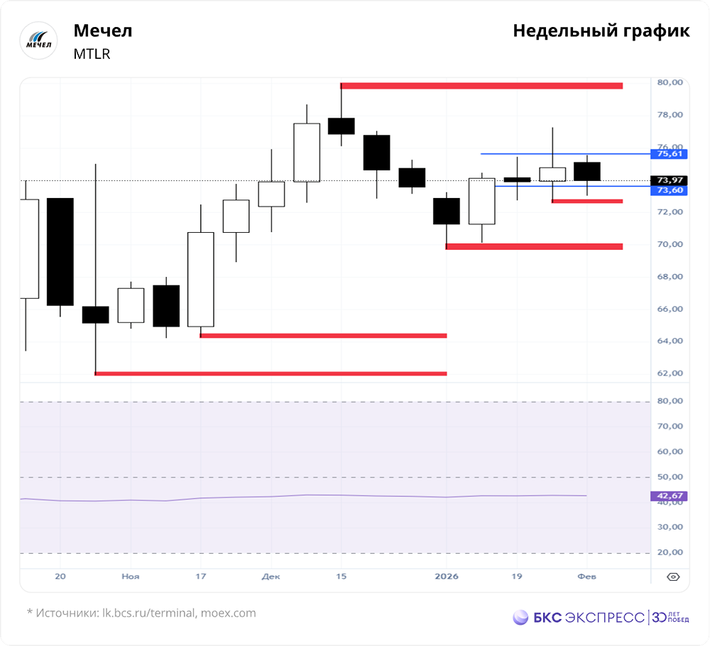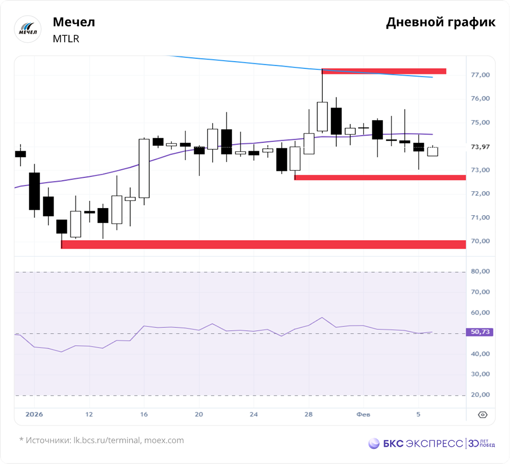 Мнение: БКС Экспресс Прогноз по акциям Мечел Акции компании «Мечел» на прошлой торговой сессии снизились на 0,49%, закрывшись на уровне 73,8 руб. На фоне падения рынка бумаги показали устойчивость. Объем торгов составил 0,38 млрд руб. Краткосрочная картина На этой неделе началась коррекция. Первая цель — сломить поддержку на уровне 72,59 руб. — пока не достигнута. Текущий минимум недели зафиксирован на отметке 73,02 руб. При пробое уровня 72,59 возможно движение в зону 70,44–71,27 руб. Этот сценарий остается актуальным, пока не будет сломлено сопротивление на уровне 77,27 руб. В первую очередь следим за ключевыми уровнями поддержки и сопротивления: 72,59 и 77,27 руб. Внешний фон Индекс S&P 500 в четверг упал на 1,24%, утром потеряв 0,1%. Индексы Азиатско-Тихоокеанского региона торгуются разнонаправленно. Нефть Brent подешевела на 2,75%, но утром показывает небольшой рост. Уровни сопротивления: 77,27, 80, 84,84 руб. Уровни поддержки: 72,59, 69,71, 64,2 руб. Долгосрочная картина Волна отскока достигла основных целей роста 73,6–75,61 руб. Ждем формирования новой структуры на недельном графике для оценки дальнейших целей. Локальные цели движения рассматриваем в краткосрочной перспективе. В долгосрочной важно следить за закрытием недельной свечи в конце торгов пятницы. Сохраняем «негативный» взгляд на акции компании из-за низких цен на уголь, высоких процентных ставок и кризиса в стальном и угольном секторах России и Китая. Высокие процентные ставки и низкие цены на уголь и сталь вынуждают компанию увеличивать долг. Ключевая ставка ЦБ РФ остается двузначной. У «Мечела» около 90% кредитов в рублях с плавающей ставкой. По нашим оценкам, текущих доходов компании недостаточно для выплаты процентов, что приведет к росту долга к 2025 году. Это уже отразилось в результатах за первое полугодие 2025 года. Автор: Мамонтов Андрей Не является индивидуальной инвестиционной рекомендацией Пост взят с соцсети [M O N D I A R A](https://i.mondiara.com/) 👉 вот ссылка на канал: https://i.mondiara.com/i/c/mechel_analytics Скачать в [App Store](https://apps.apple.com/ru/app/m-o-n-d-i-a-r-a/id6475953453) Скачать в [Google Play](https://play.google.com/store/apps/details?id=com.mondiara.app) Валюта расчёта - Ваши добрые мысли! Спасибо, что с нами! Источник: bcs-express.ru