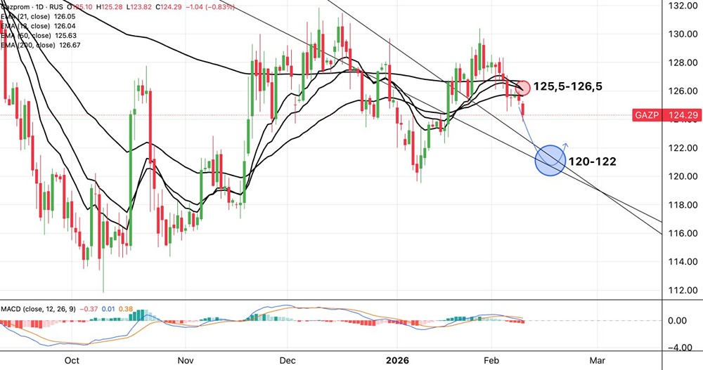 Акции Газпрома вышли за пределы зоны турбулентности ₽125,5–126,5 вниз, нахождение выше этих уровней было слишком непродолжительным, устойчивого позитива не образовалось. Технически вероятна коррекция до трендовых наклонных поддержек, а также отработка флэта — диапазон ₽120–122. MACD также указывает на отсутствие интереса в лонге. Не является индивидуальной инвестиционной рекомендацией [mondiara.com](https://mondiara.com) 👆 Больше новостей и анализа Скачать приложение в [App Store](https://apps.apple.com/ru/app/m-o-n-d-i-a-r-a/id6475953453) Скачать приложение в [Google Play](https://play.google.com/store/apps/details?id=com.mondiara.app) Пост взят с международного сервиса для инвесторов и трейдеров [M O N D I A R A](https://i.mondiara.com/) Источник: Invest Premium