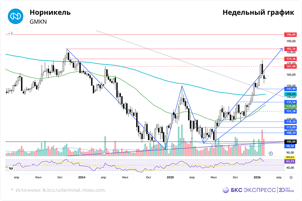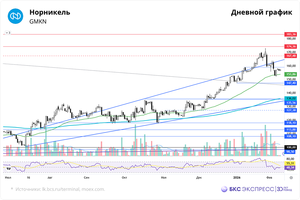 Мнение: БКС Экспресс Прогноз по акциям Норникеля Акции «Норникеля» выросли на 2,54% до 156,92 рубля в пятницу. За выходные они потеряли 0,14% и закрылись на уровне 156,7 рубля. В пятницу объем торгов составил 3,1 миллиарда рублей. Сегодня утром акции добавили 0,3% по сравнению с закрытием предыдущего дня. Краткосрочный обзор • Котировки выросли из-за стабилизации сырьевых рынков. Индекс МосБиржи почти не изменился, потеряв 0,06% за основную сессию и 0,01% на вечерних торгах. • На прошлой неделе сформировалась нейтральная свеча с длинными тенями. Это указывает на колебания на рынках ключевых металлов, что является умеренно негативным сигналом, повышающим неопределенность. • Акции выросли на фоне платиноидов, меди и никеля. Свеча не дает четкого бычьего сигнала из-за нестабильных внешних факторов, но частично сглаживает негатив среды и четверга. • Разворот около 50-дневной скользящей средней не увеличивает ее значимость. При возобновлении падения ближайшей поддержкой станет уровень 147,4 рубля, а дополнительным уровнем — 150 рублей. • Дипломатическая неопределенность позволяет сосредоточиться на сырьевых рынках. Большинство металлов торгуются в плюсе, снижая риск дальнейшего падения. Акции, вероятно, продолжат боковое движение в диапазоне 153–164 рубля. • Негативный сценарий возможен при падении ниже 160 рублей. Снижение цен на платиноиды, медь и никель приведет к падению акций до 135,6 рубля. В этом случае влияние технической картины и внешних рисков усилится. • В среду «Норникель» опубликует финансовые результаты за 2025 год по МСФО. Ожидается хорошая отчетность благодаря стабильному производству и высоким ценам на металлы. Дивиденды в 2025 году маловероятны из-за налогов, процентных расходов и фокуса на снижении долга. • В пятницу состоится заседание ЦБ. Рынок ожидает паузу или снижение ключевой ставки на 50 базисных пунктов. Консенсус склоняется к паузе, но, по нашему мнению, ЦБ продолжит снижение ставки и возьмет паузу только в марте. Внешний фон В пятницу индекс S&P 500 вырос на 1,97%. Сегодня фьючерс S&P 500 прибавил 0,1%. Индексы Азиатско-Тихоокеанского региона растут. На мировых рынках: платина +0,1%, палладий +1,2%, медь +0,2%, никель +0,7%. • Уровни сопротивления: 174,4, 183,4, 196. • Уровни поддержки: 147,4, 143, 135,6. Долгосрочный обзор • «Норникель» опубликовал производственные результаты за IV квартал и 2025 год. Результаты нейтральные по объемам, но умеренно негативные из-за планов сократить выпуск палладия и платины на 10% в 2026 году. Стабильное производство и высокие цены на металлы могут привести к сильным финансовым результатам за 2025 год. • Компания представила обзор рынков никеля, меди и платиновых металлов. Профицит в 2026 году ожидается только по никелю, медь и платина будут в дефиците. Рынок палладия будет близок к балансу, но избыточный инвестиционный спрос может создать дефицит. • Золото откатилось от рекордных уровней, оставаясь дорогим. Основной фактор — усиление спекулятивного спроса из-за нестабильности в Иране, кризиса в Карибском бассейне, дела против Джерома Пауэлла и внутренних волнений в США. • Паттерн «Двойное дно» завершен, но есть потенциал роста до 183,4 рубля. Медвежье закрытие январской свечи ставит под вопрос достижение этой цели. • Долгосрочная техническая картина нейтральная. Котировки поддерживаются высокими ценами на металлы. Ожидается постеп